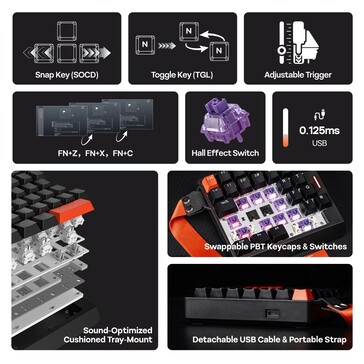 Le clavier est doté d'un boîtier en plastique et d'une plaque en aluminium pour une meilleure stabilité. Les commutateurs à effet Hall sont conçus pour une réponse particulièrement rapide des touches, et le point de déclenchement est également réglable. Le rétroéclairage RGB et les capuchons de touches en PBT sont standard. Le clavier de 350 grammes est livré avec une dragonne pour faciliter le transport. Windows et Linux sont officiellement pris en charge, mais pas macOS.