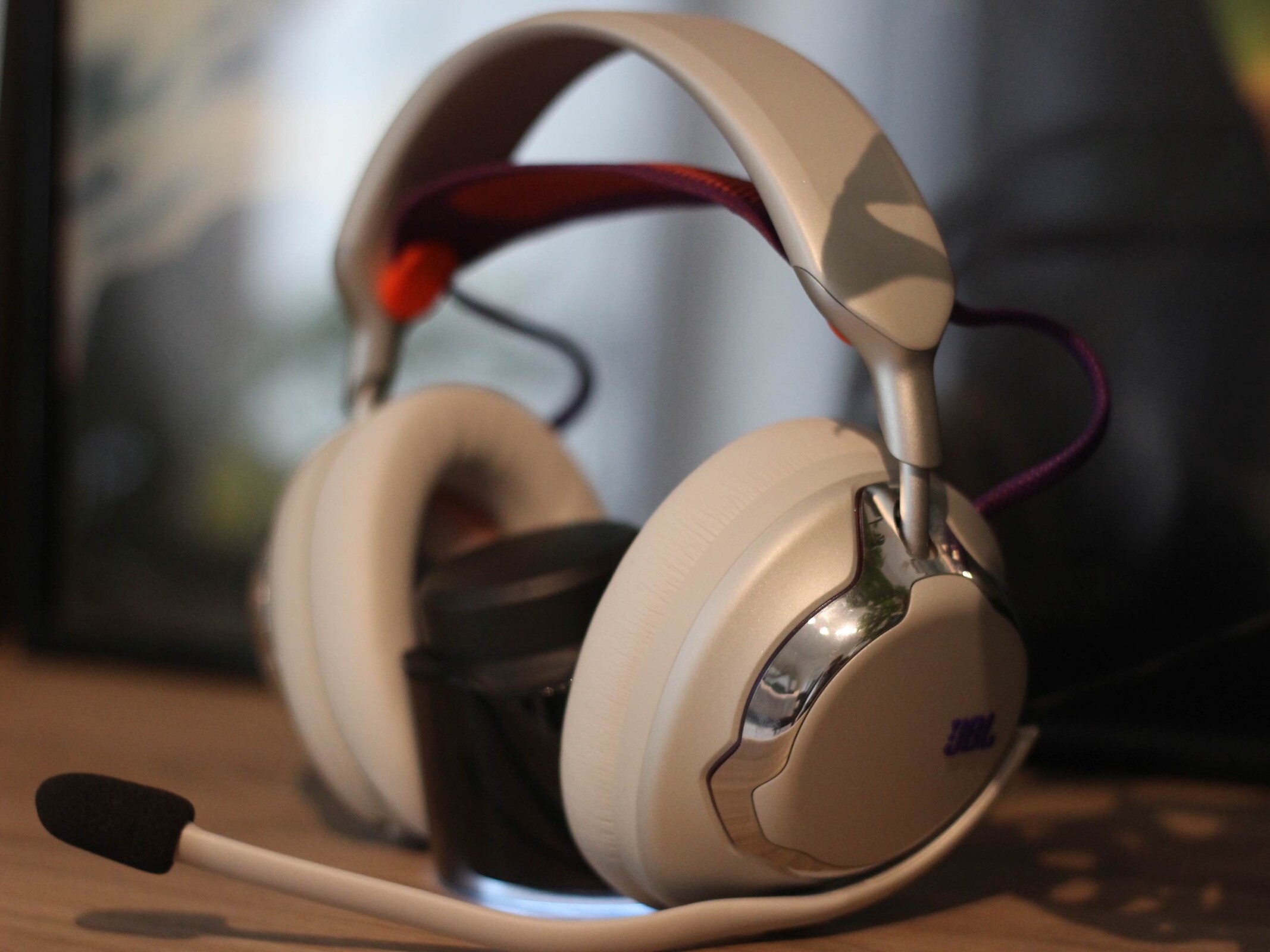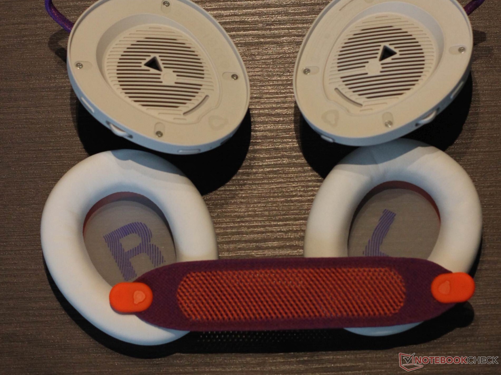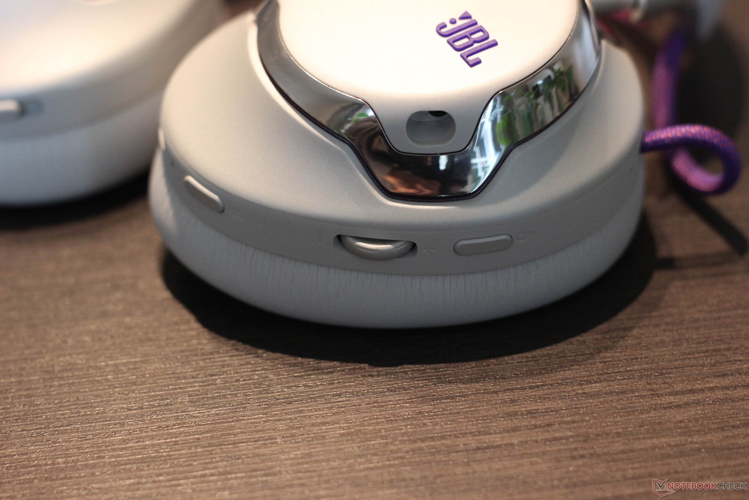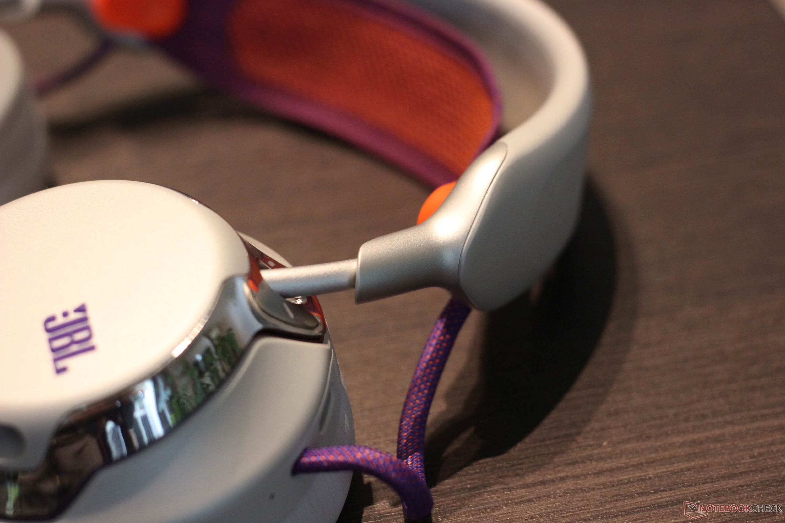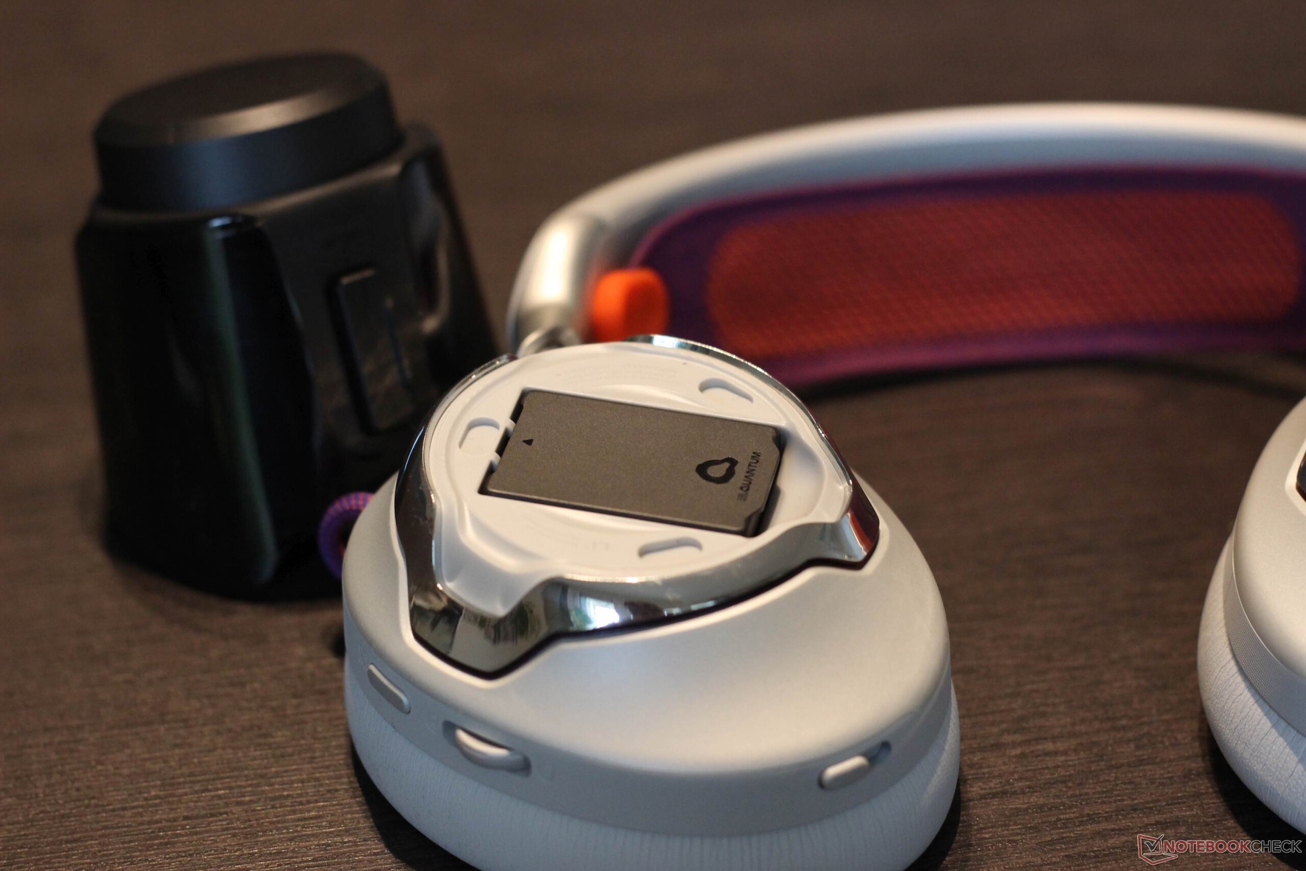 Le JBL Quantum 950 Wireless est livré avec une gamme complète d'accessoires. Une station de base pouvant être connectée via USB type C est incluse. Elle offre plusieurs fonctions : Elle sert non seulement de dongle 2,4 GHz, mais aussi d'unité de contrôle et de station de charge pour l'une des deux batteries rechargeables fournies. Un microphone à perche et un microphone spécialement conçu pour l'étalonnage sont également inclus. Un sac en tissu très utile est également inclus. Le casque lui-même est doté d'accents métalliques et de trois boutons, de deux commandes rotatives et d'un curseur. Les boutons offrent un point de pression agréable. L'oreillette elle-même a un design frappant avec des accents métalliques et le métal est également utilisé comme matériau. Les oreillettes sont maintenues en place par un aimant et sont faciles à remplacer. Le bandeau lui-même est fait d'un tissu en maille, qui peut également être remplacé, ce qui est généralement un point très positif. Il en va de même pour la batterie, qui peut également être remplacée facilement. Comme prévu, les surfaces métalliques sont un peu sensibles aux traces de doigts. La version blanche ne lésine pas sur les contrastes. Le bandeau est violet et orange, tout comme les câbles très visibles et le logo JBL.