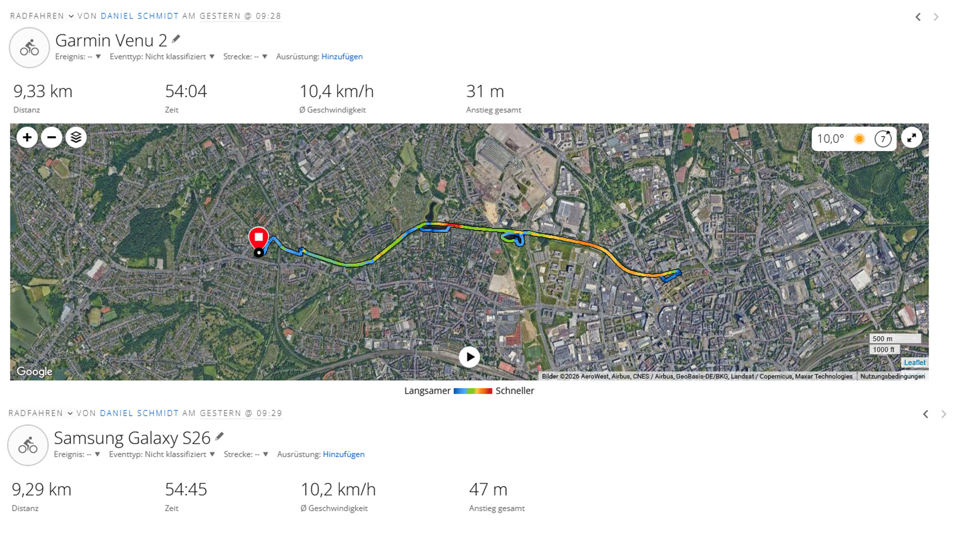 Lors d'une balade à vélo, nous avons comparé le smartphone de Samsung au Garmin Venu 2, et il s'est avéré aussi précis que le Modèle Ultra. Bien qu'il soit un peu moins précis que la smartwatch au bord du lac, le S26 a démontré de meilleures caractéristiques de réception entre les bâtiments.