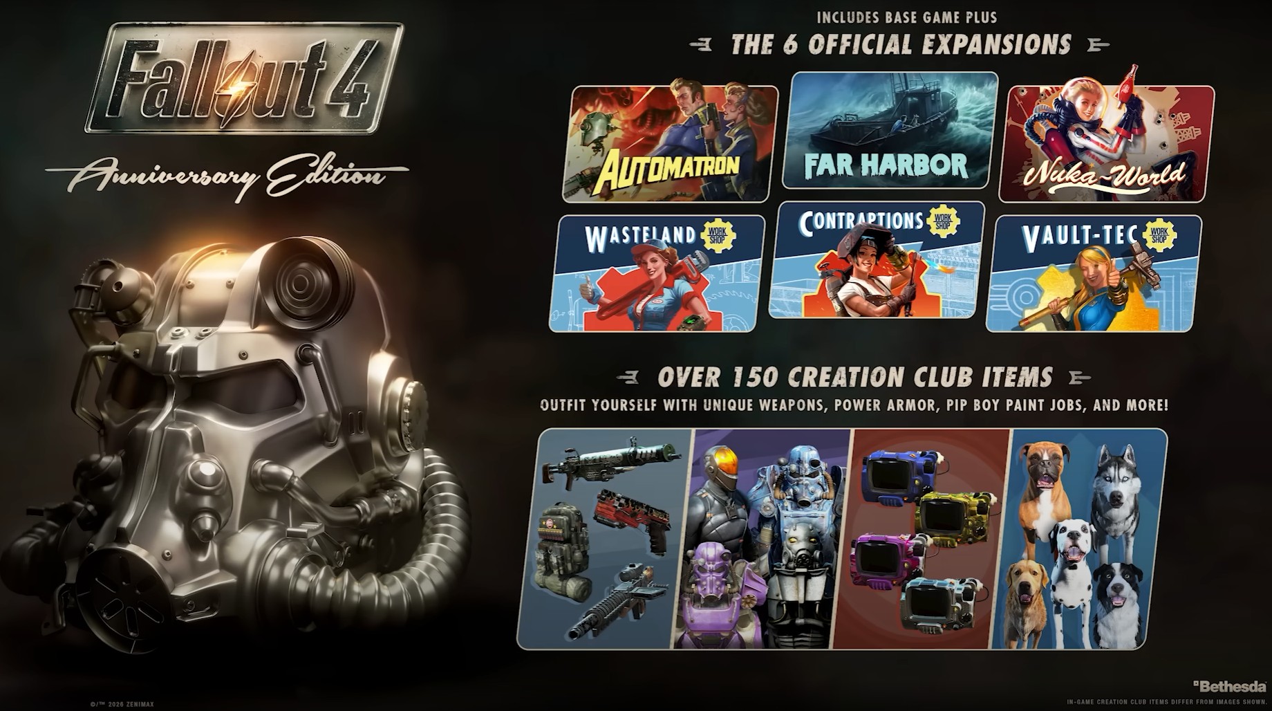 Selon le communiqué de presse, c'est la première fois que Fallout 4 est disponible sur une console Nintendo. Le jeu, disponible en version numérique sur le Nintendo eShop au prix de 59,99 $, comprend le jeu de base et six modules complémentaires officiels. Plus de 150 créations sont également incluses, car il n'y a pas de menu Créations dans la version Nintendo Switch 2 du jeu.