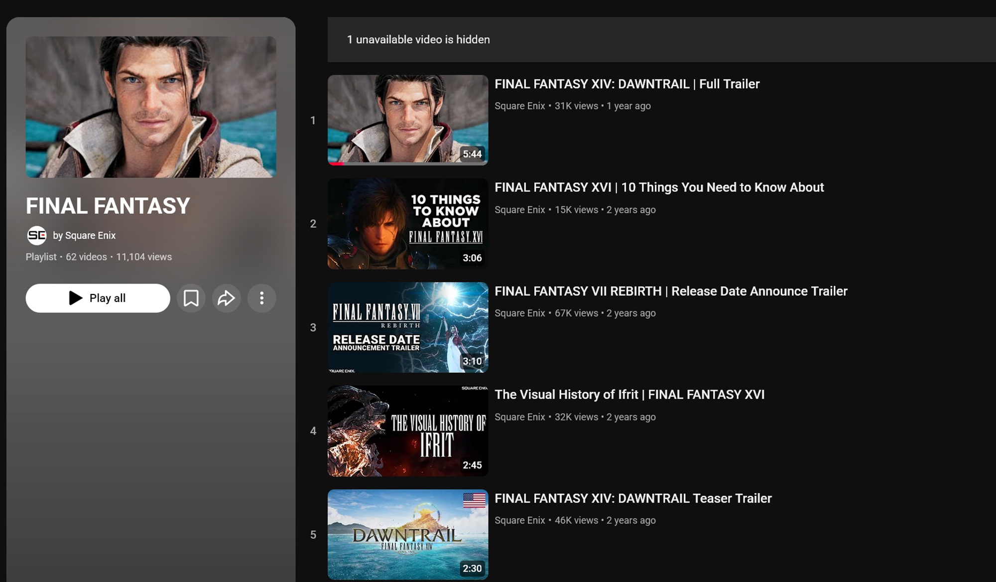 La liste de lecture de YouTube présente des bandes-annonces promouvant des ajouts majeurs à la populaire série de jeux de rôle. Une vidéo de l'extension Final Fantasy 14 : Dawntrail a été la dernière nouvelle sélection, postée en 2024. Les éditeurs préparent souvent le contenu à l'avance, mais gardent les médias non répertoriés jusqu'à ce qu'ils soient révélés. Cela dit, les joueurs ont déjà vu des entrées privées similaires de la part de Rockstar, qui n'ont pas donné lieu à une nouvelle Bande-annonce de GTA 6 .