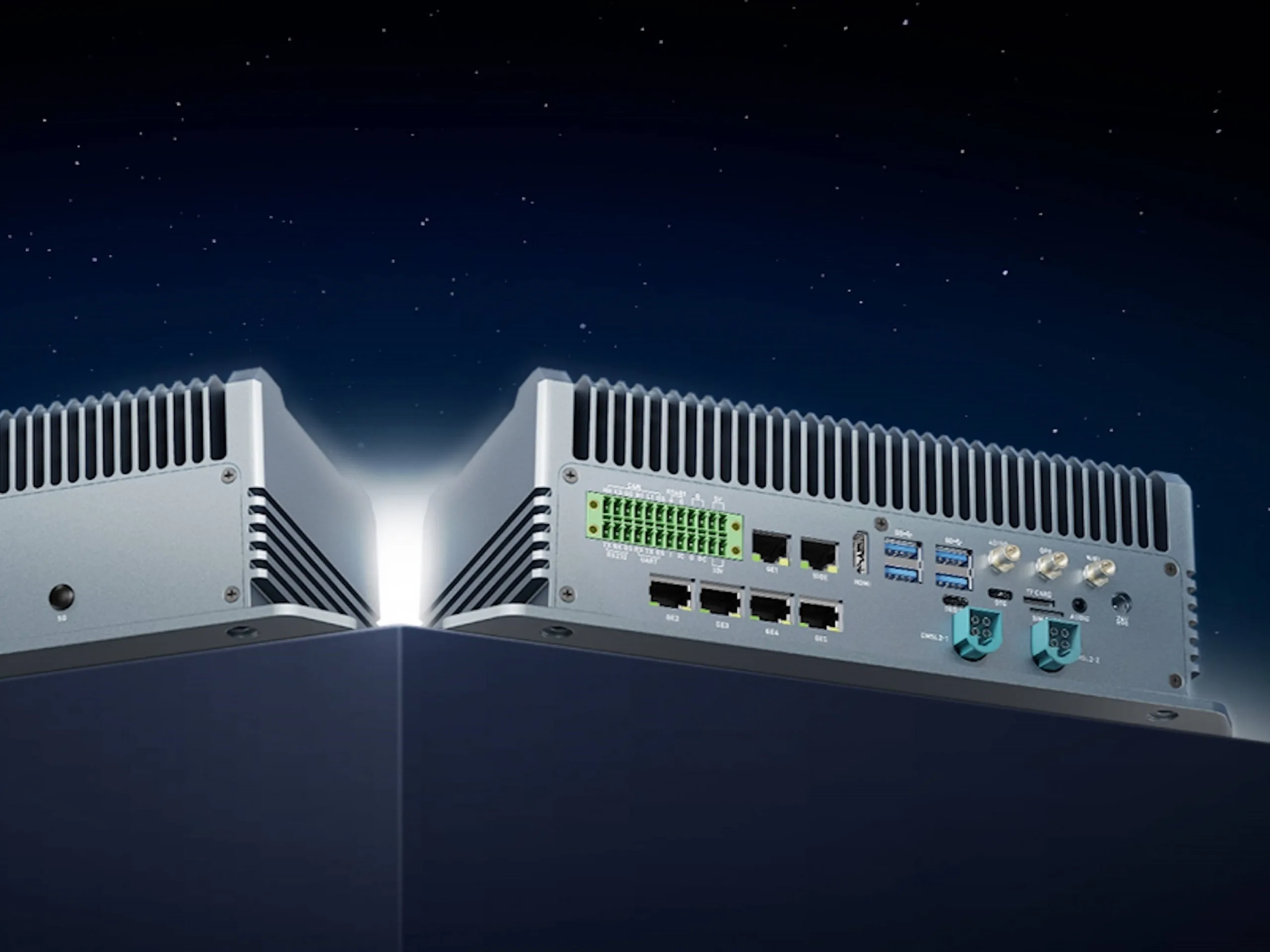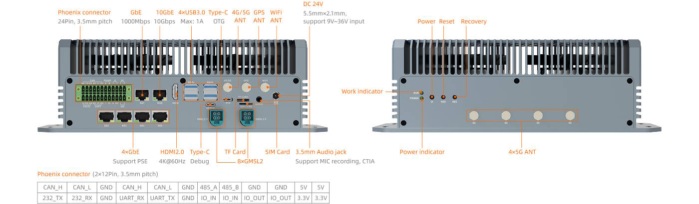 Le mini PC, qui mesure 277,95 x 136,09 x 88,0 millimètres, est équipé de 64 Go de mémoire vive LPDDR5 et d'un espace de stockage eMMC d'une capacité de 64 Go. Un SSD M.2 au format M.2 2280 peut également être installé. La sortie vidéo peut être facilitée par HDMI 2.0 ou par des connexions GMSL2 spéciales. La connectivité réseau est possible via un certain nombre de ports Ethernet à 10 Gbps et 5 Gbps. D'autres ports incluent USB 3.0, USB 3.2, des connecteurs Phoenix, RS485, RS232, CAN 2.0 et UART.