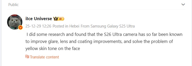 L'appareil photo à téléobjectif 3x amélioré est équipé du seul nouveau capteur, et même cela pourrait décevoir de nombreux clients, comme Ice Universe l'a souligné pendant des mois. Néanmoins, Samsung pourrait encore apporter des améliorations significatives à l'appareil photo quadruple du Galaxy S26 Ultra, comme le suggère un récent message sur Weibo suggère. Selon des indications antérieures, l'optique nettement plus lumineuse de l'appareil photo phare à venir semble recevoir un revêtement amélioré pour réduire les artefacts tels que les reflets de l'objectif. Samsung semble s'inspirer de Vivo ou de Sony, qui utilisent le revêtement Zeiss T* dans ce but précis.