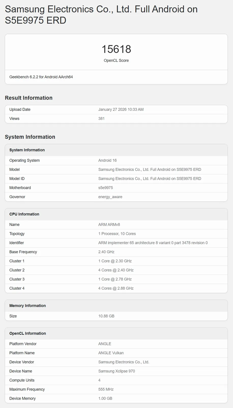 Si le modèle portant le numéro S5E9975 ERD est effectivement un système de test Samsung pour le successeur de l Exynos 2600il présente actuellement des performances très médiocres. Les performances du GPU ont été mesurées ici. Comme prévu, il s'agit d'un Samsung Xclipse 970 qui, selon Geekbench, est équipé de 4 unités de calcul à une vitesse d'horloge de 555 MHz. C'est environ deux fois moins et deux fois moins rapide que le système de test Exynos 2600, qui a déjà fait sa marque sur Geekbench à plusieurs reprises. Si l'on considère que le GPU est deux fois moins puissant, le résultat de 15.618 points au test OpenCL n'est pas trop mauvais, mais reste bien sûr nettement inférieur au niveau du système de test Exynos 2600