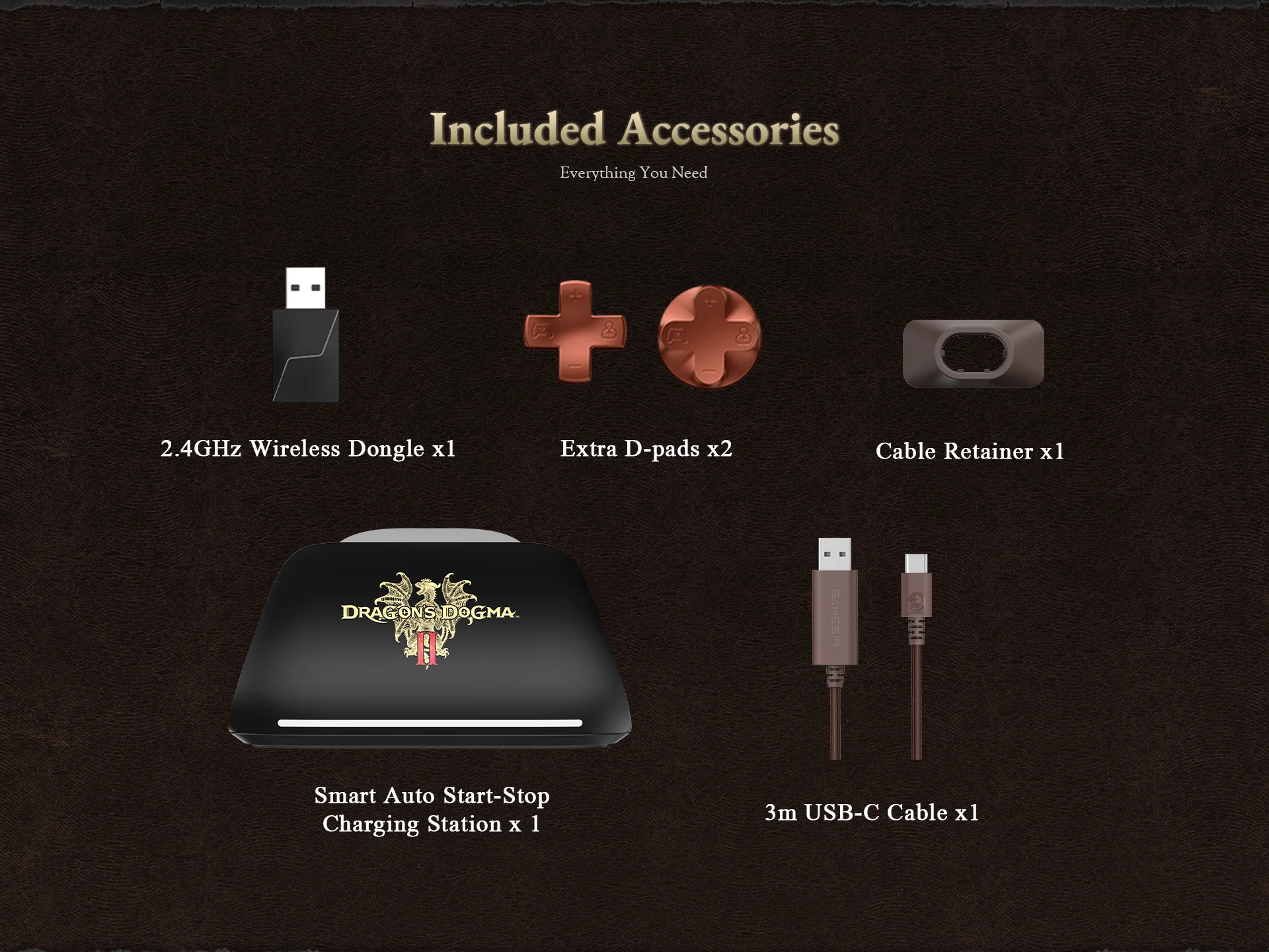 En plus de la manette et du socle de chargement, les acheteurs reçoivent également un dongle sans fil 2,4 GHz, deux D-Pads supplémentaires de différents designs, un support de câble et un câble tressé USB-C vers USB-A de 3 m de long.