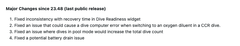Garmin s'est également attaqué à un problème lié à l'indicateur d'aptitude à la plongée de la Descent G2, où le temps de récupération pouvait être incohérent. Des correctifs ont été apportés aux problèmes liés aux plongées enregistrées en mode piscine, à l'augmentation inattendue du nombre total de plongées et à une erreur de l'ordinateur de plongée survenant lorsque l'utilisateur passait à un diluant d'oxygène pour une plongée CCR.