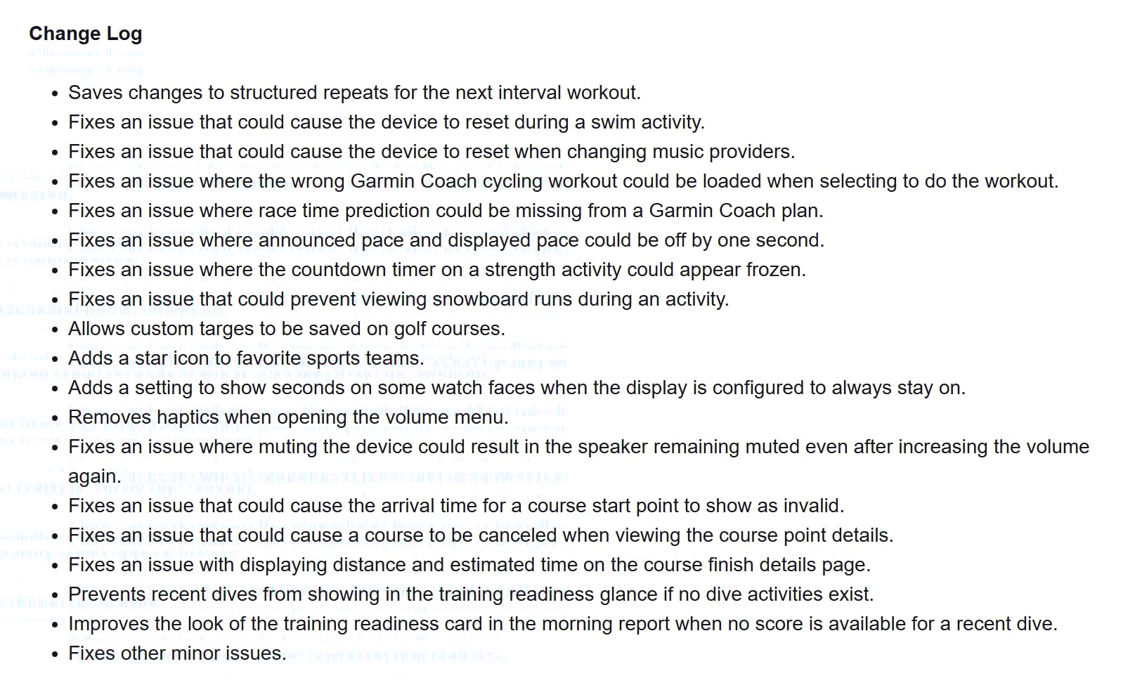Les utilisateurs des Forerunner 570 et Forerunner 970 doivent noter que le retour haptique qui se produisait lorsque vous ouvriez le menu du volume a été supprimé. Garmin n'a pas expliqué les raisons de cette décision. L'entreprise s'est attaquée à quelques bugs susceptibles de provoquer la réinitialisation de ces smartwatches, liés à des activités de natation ou au changement de fournisseur de musique. Elle a également résolu certains problèmes liés à Garmin Coach, un problème avec le compte à rebours dans une activité de force, et un bug qui empêchait d'augmenter le volume après l'avoir mis en sourdine.