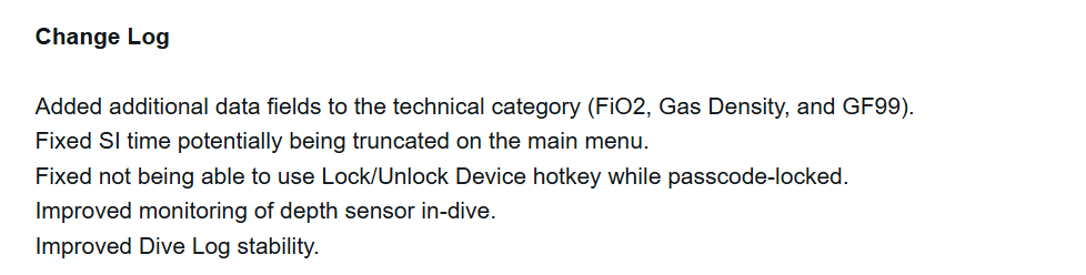 La version 2.07 du logiciel système apporte de nouveaux champs de données techniques pour le Descent X30. Il s'agit de la fraction d'oxygène inspiré (FiO2), de la densité gazeuse et du GF99. Dans un post sur le Garmin Foruml'entreprise indique qu'elle a amélioré la surveillance de la profondeur en plongée grâce au capteur de l'appareil. De plus, la stabilité de l'ordinateur de plongée Dive Log a été optimisée.