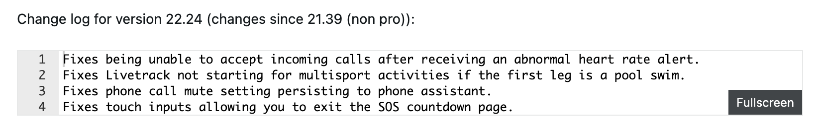 Avec la version bêta 22.24, Garmin corrige un problème lié à cette nouvelle fonctionnalité LiveTrack. Un problème qui empêchait le démarrage automatique de LiveTrack pour les activités multisports, en particulier celles qui commençaient par une natation en piscine, a été résolu. Dans cette mise à jour, l'entreprise a également corrigé un problème qui empêchait les utilisateurs d'accepter un appel entrant à la suite d'une alerte de fréquence cardiaque anormale. De plus, les problèmes liés à la mise en sourdine des appels téléphoniques et à la page de compte à rebours SOS ont également été résolus.