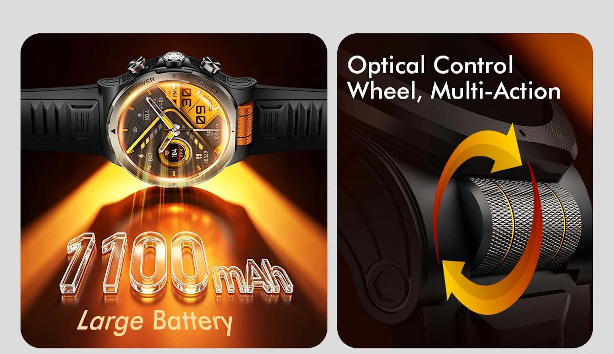 Un écran AMOLED d'une résolution de 466 x 466 pixels est également présent. La smartwatch utilise en outre une batterie d'une capacité de 1 100 mAh, et le fabricant annonce une autonomie de plus de 100 jours. Ce chiffre n'est pas totalement irréaliste, bien que l'autonomie réellement réalisable avec les wearables dépende fortement de facteurs tels que la fréquence à laquelle l'écran est activé par des notifications ou manuellement. Le Rogbid SpinX est également équipé d'une lampe de poche.