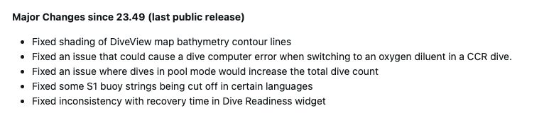Aujourd'hui, avec le logiciel système 25.14, Garmin s'attaque à d'autres bugs rencontrés par les utilisateurs des Descent Mk3 et Descent Mk3i(actuellement 1 399,99 $ chez Amazon). Tout d'abord, la société a résolu un problème d'ombrage des lignes de contour de la bathymétrie sur la carte DiveView. Un correctif a été apporté à une erreur de l'ordinateur de plongée, qui survenait lorsque les utilisateurs passaient à un diluant d'oxygène lors d'une plongée CCR.