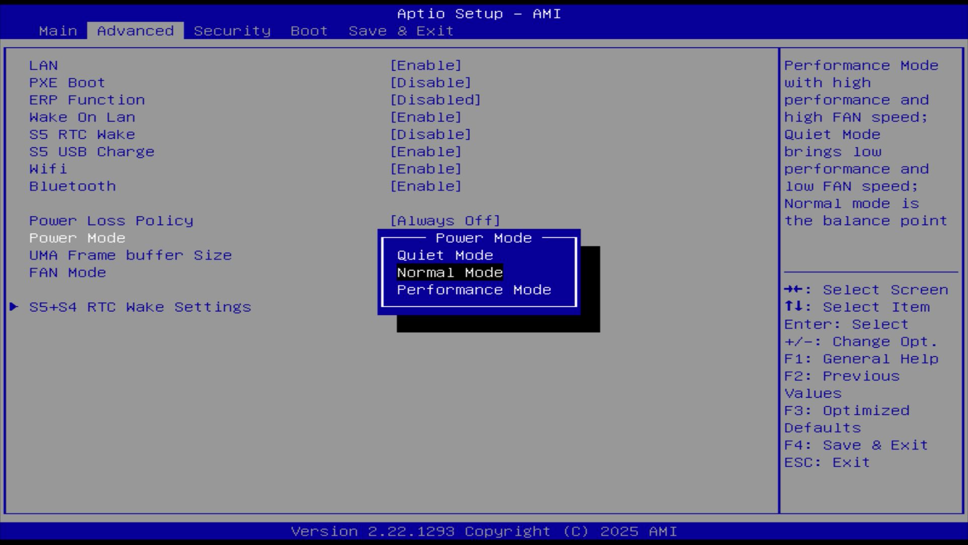 Tous les tests ont été effectués en "mode normal", tel qu'il est livré. Le mode performance optionnel, qui peut être sélectionné dans le BIOS, augmente la vitesse du ventilateur et conduit à des niveaux de bruit sensiblement plus élevés sous charge.