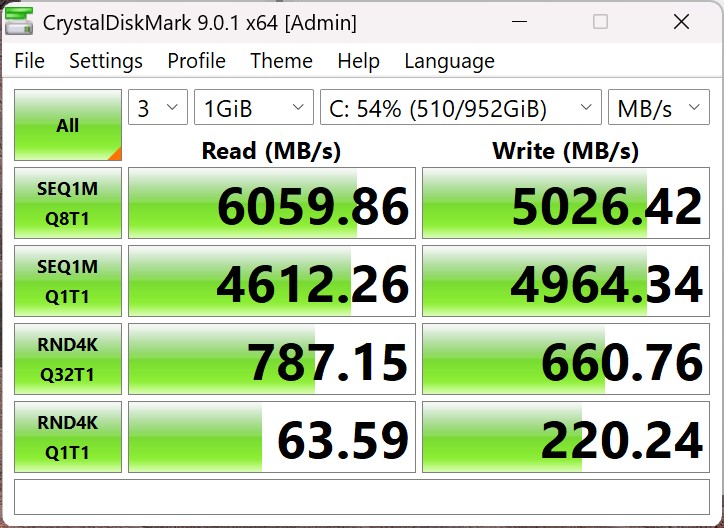 The Geekom A8 is equipped with a 1 TB Lexar SSD (PCIe 4.0 x4), which impresses with its high transfer rates and fast access times. The mini PC therefore offers very high everyday and system performance. The passive cooling also ensures almost constant performance even under continuous load.