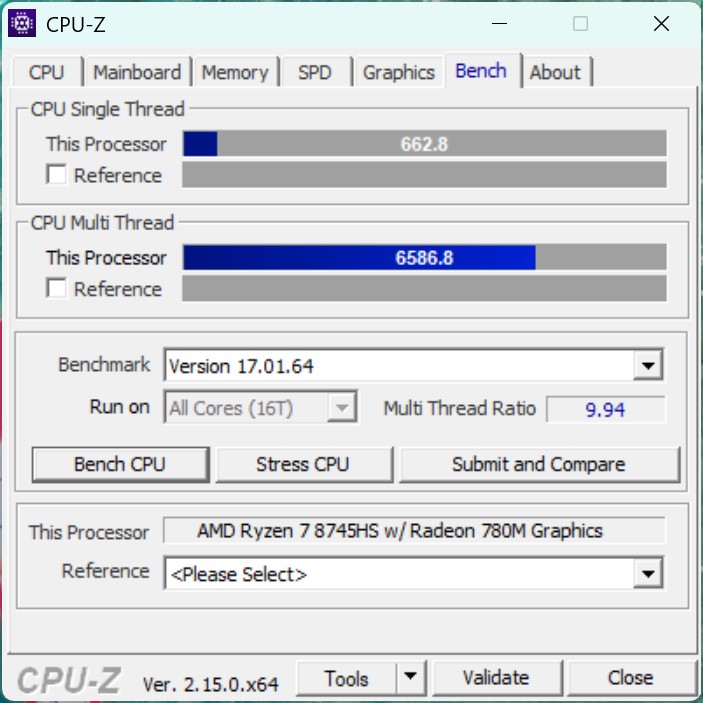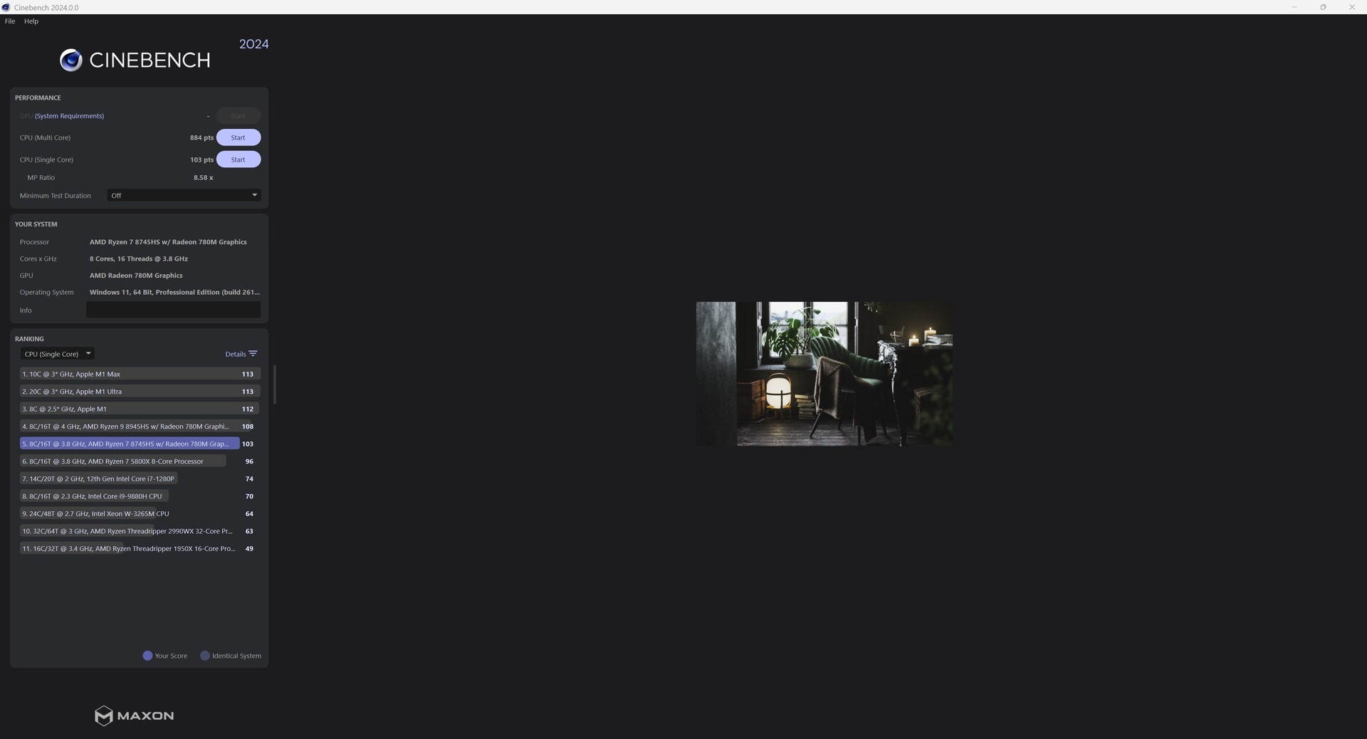 Le Geekom A8 avec AMD Ryzen 7 8745HS (Zen 4, 8 cœurs) peut atteindre une consommation d'énergie à court terme de 60 watts, mais descend à environ 35 watts en pleine charge continue. Ceci est particulièrement visible dans les benchmarks multi-cœurs tels que le test d'endurance Cinebench R15, tandis que la performance monocœur est à un bon niveau en comparaison. Comparé au Geekom A8 avec AMD Ryzen 9 8945HS, l'appareil peu performant est juste derrière.