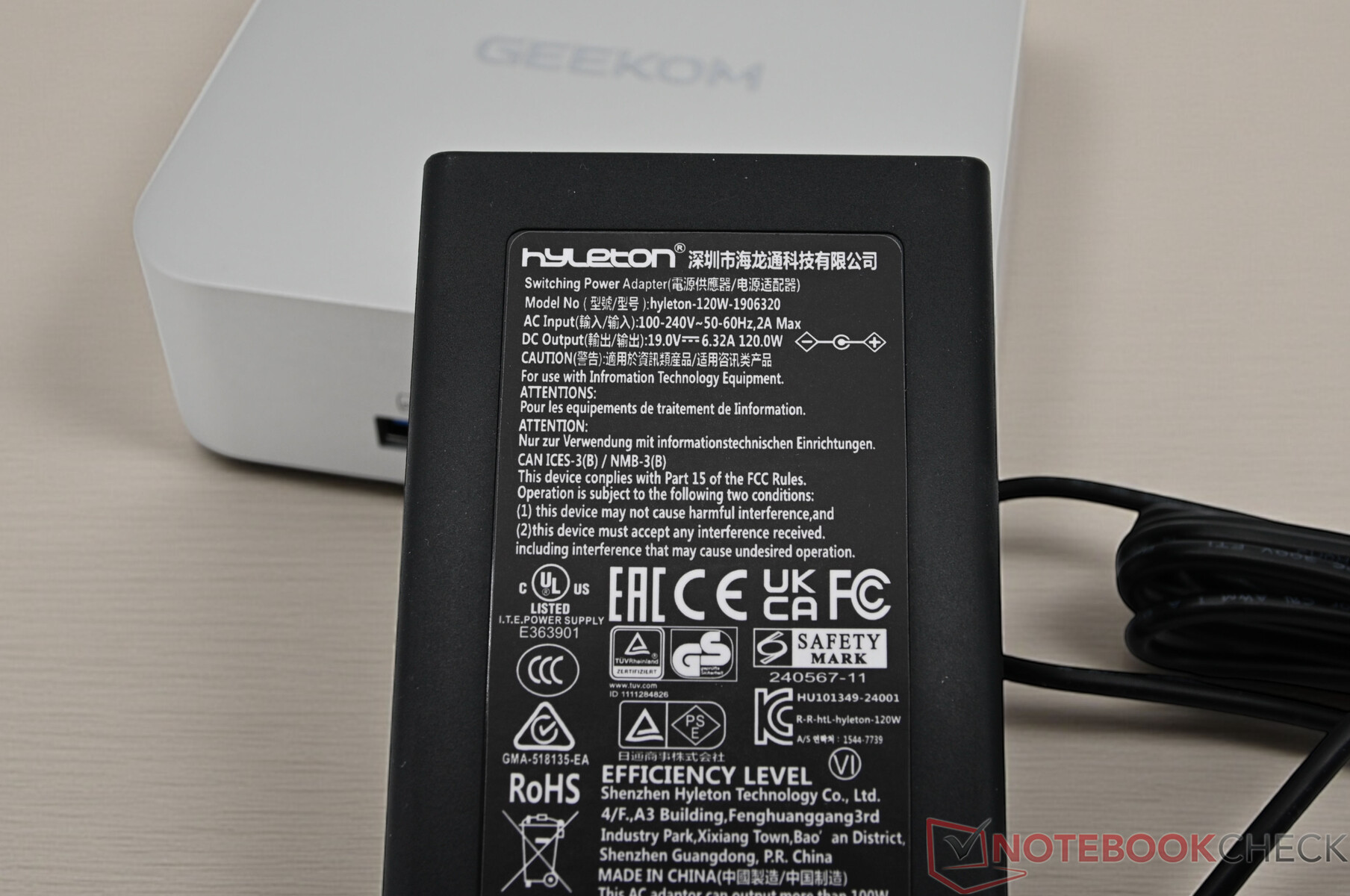 Le Geekom A8 avec Ryzen 7 8745HS impressionne par sa grande efficacité énergétique. Le mini PC consomme très peu d'énergie en mode veille. Même en pleine charge, la consommation reste agréablement basse avec environ 68 watts en moyenne et jusqu'à 97 watts en charge maximale. Cela fait de l'A8 l'un des appareils les plus économiques de sa catégorie. Le bloc d'alimentation de 120 watts offre des réserves de puissance suffisantes.