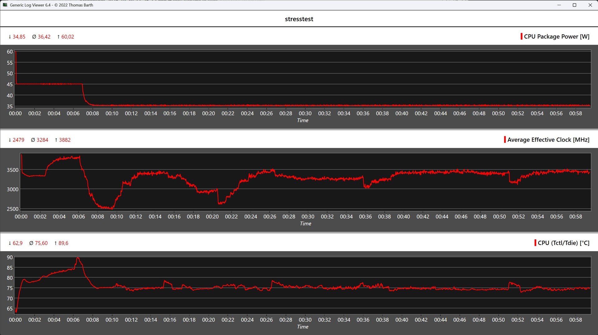 Le boîtier du Geekom A8 reste agréablement frais, aussi bien en mode veille qu'en charge, sans aucun point chaud problématique. Lors du test de stress, la température du Ryzen 7 8745HS monte brièvement à environ 90 °C, mais cela n'est pas grave. Le système de refroidissement dissipe de manière fiable les 35 watts TDP présents en permanence.