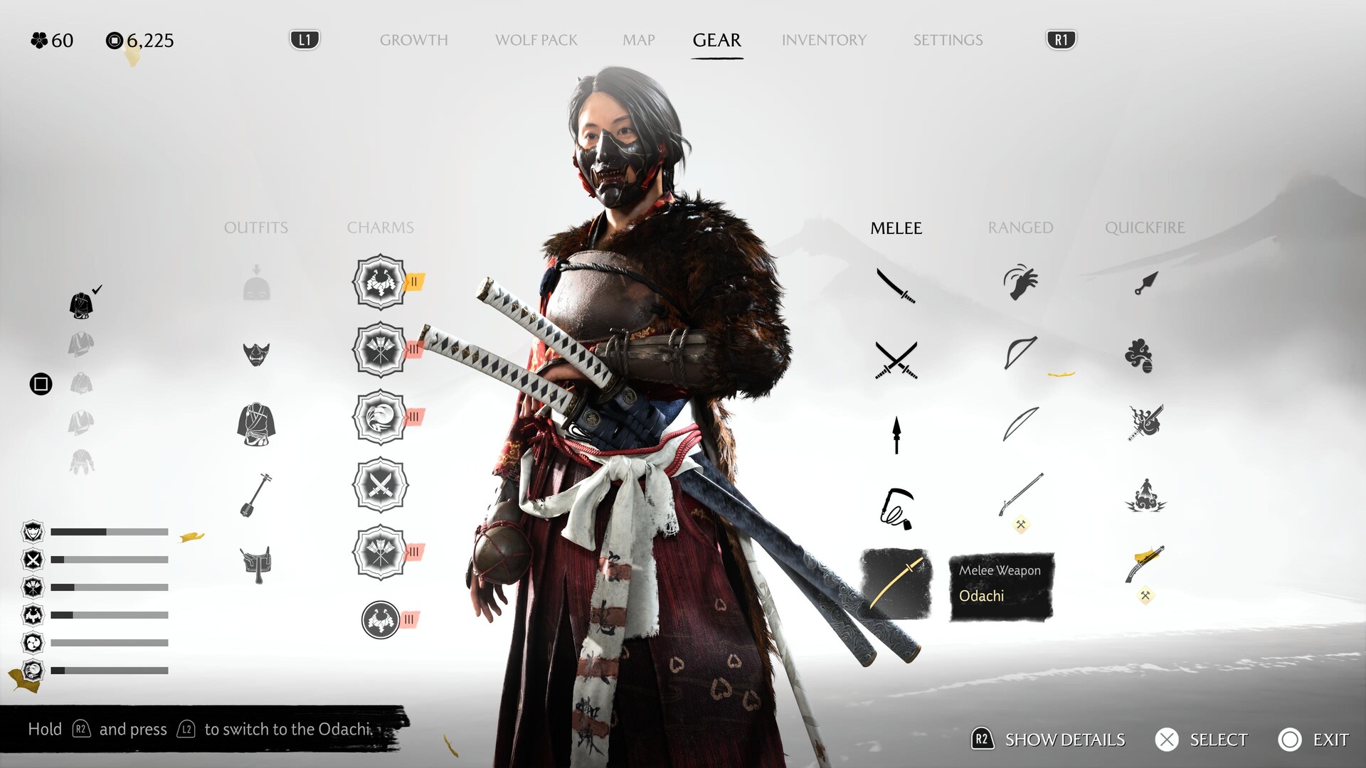 L'un des changements les plus notables dans Ghost of Yotei est la variété des armes, une amélioration bien nécessaire par rapport au combat basé sur les positions de Tsushima. Il peut être difficile d'équilibrer plusieurs armes, mais rien dans le jeu ne semble surpuissant. Le changement d'arme est transparent et nécessaire car les ennemis ont souvent un arsenal complet et certaines armes sont difficiles à contrer. Par exemple, les Yari sont contrés par les doubles Katanas, les brutes par l'Odachi et ainsi de suite. Le combat proprement dit est assez difficile, même en difficulté normale. De nombreux ennemis vous assaillent et il est difficile de les suivre à la trace. Par défaut, la possibilité de verrouiller des ennemis individuels est désactivée, et je recommande vivement de l'activer dans les paramètres. Plusieurs aspects de la difficulté, tels que les dégâts subis, la vitesse de détection des ennemis et leur agressivité, sont personnalisables au cas par cas. Il s'agit d'une version édulcorée de ce que propose Doom : The Dark Ages offre. Les parades sont faciles à maîtriser avec un peu d'entraînement. Pour intégrer le timing dans votre mémoire musculaire, jouez avec l'armure Bounty Hunter qui désactive les déviations normales mais assouplit le timing des parades. Les combats à distance bénéficient d'une bouffée d'air frais avec l'inclusion de bombes lançables et d'un pistolet, pour une raison que j'ignore. Je n'ai pas trop aimé, mais cela peut varier. Une quête annexe permet d'obtenir un charme qui permet de tirer automatiquement sur la tête des ennemis sans aucun effort, pour un 360-no-scope digne d'un clip.