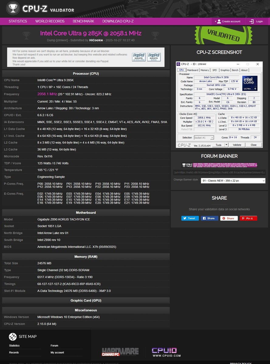 Hicookie a déclaré : "13K atteint ! Un grand merci à ADATA Technology pour cette mémoire exceptionnelle et au Core Ultra 285K d'Intel, dont le contrôleur de mémoire est phénoménal. Associé au GIGABYTE Z890 AORUS TACHYON ICE, nous avons poussé la DDR5 au-delà des 13 000 MT/s."