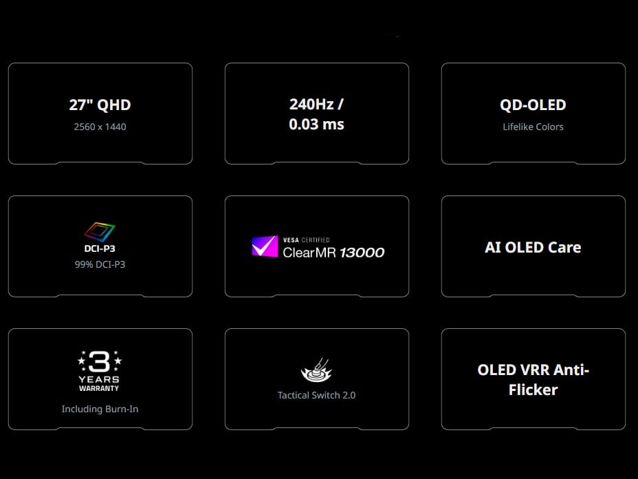 Parmi les autres caractéristiques, citons un taux de rafraîchissement de 240 Hz et un temps de réponse de 0,03 ms, ce qui en fait l'écran idéal pour les joueurs compétitifs. Il est également doté d'options exclusives telles que Tactical Switch 2.0, qui vous permet de basculer entre différentes tailles d'affichage et différents rapports d'aspect, ainsi que d'une fonction d'accentuation des noirs et d'un mode de vision nocturne. En outre, le moniteur est livré avec un support entièrement réglable, une garantie OLED de trois ans et une solide sélection de ports, notamment un DisplayPort 1.4 et un USB-C avec mode DP Alt et charge de 15 W.