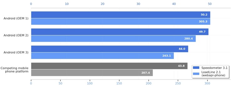 Speedometer est un projet commun de Apple, Google et Mozilla, qui simule des tâches courantes de l'utilisateur, comme cliquer sur des boutons pour naviguer et faire défiler les pages, afin de mesurer la "vivacité" d'un navigateur. Les résultats de l'analyse comparative partagés par Google montrent que les téléphones phares Android, dont le nom n'a pas été dévoilé, surpassent les derniers téléphones d'une "plateforme de téléphonie mobile concurrente" (lire : iOS).