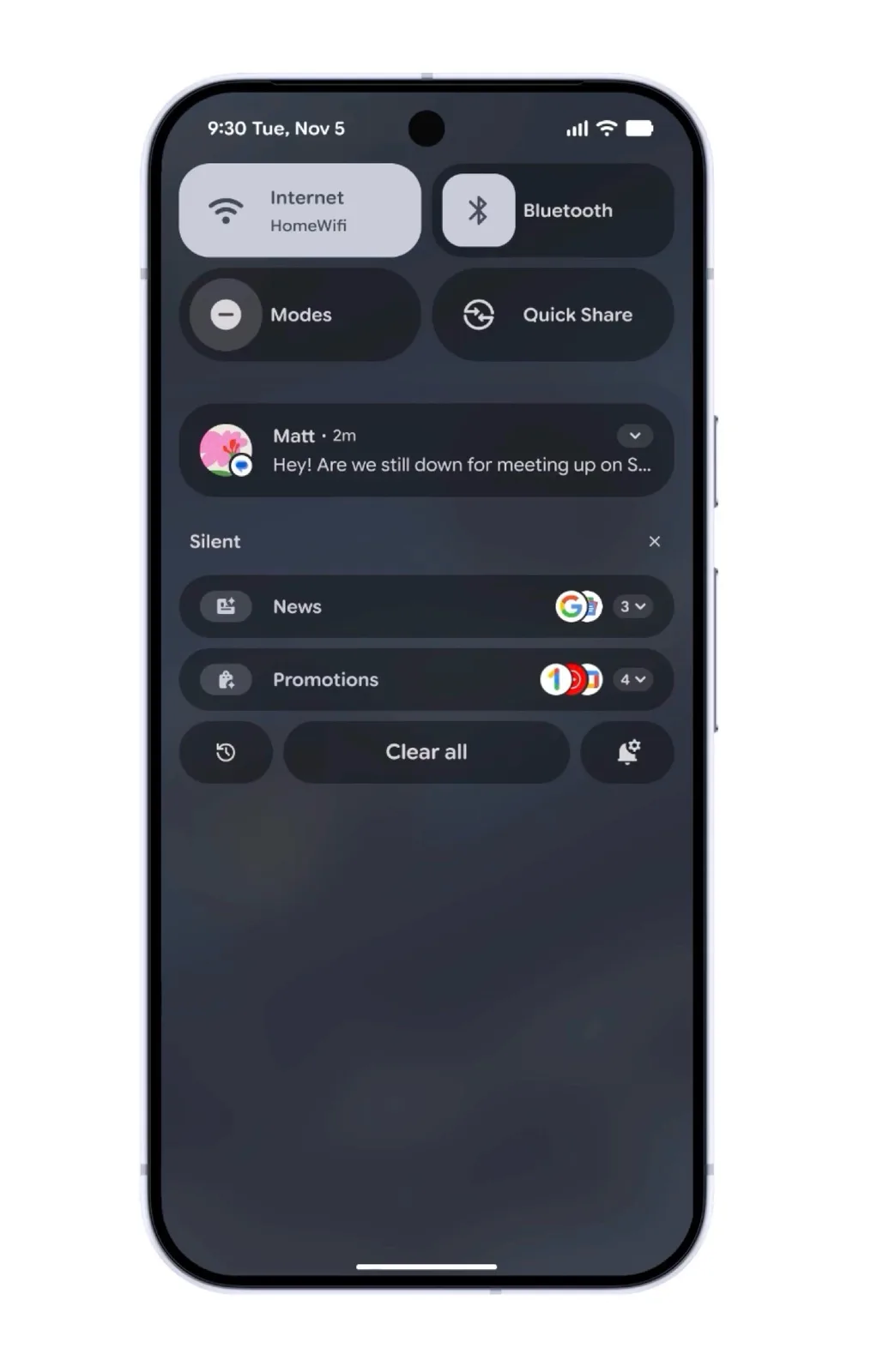 Lorsqu'un thème est utilisé, la mise à jour appliquera également la couleur aux icônes des applications qui ne prennent pas en charge les thèmes, car les icônes correspondantes sont générées par l'intelligence artificielle. Les notifications entrantes peuvent être automatiquement résumées par l'IA après la mise à jour, tandis que les messages de faible priorité, tels que les publicités, sont regroupés et affichés dans un format plus petit.