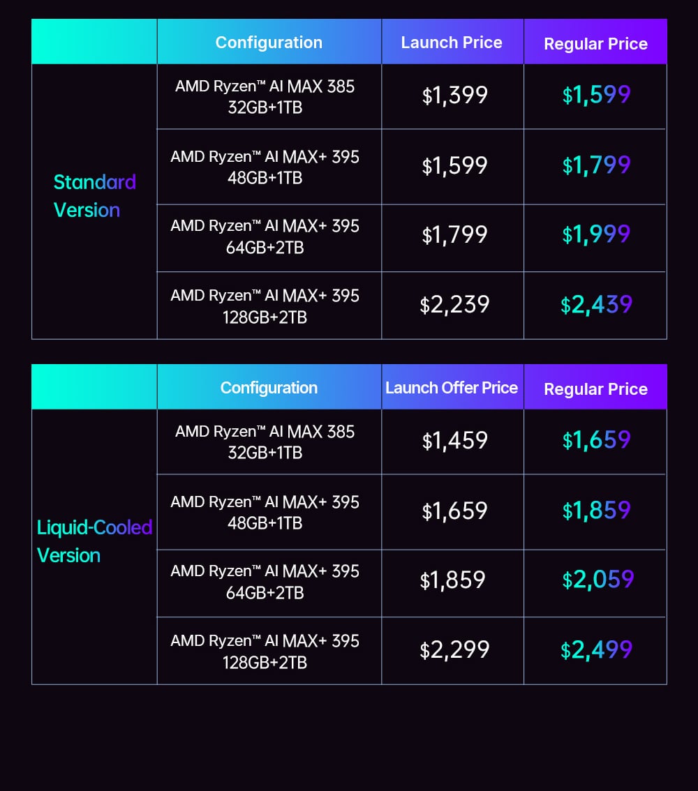 Plus précisément, le OneXFly Apex a démarré à 1 399 $ sur Indiegogo avec 32 Go de RAM, 1 To de stockage et un processeur AMD Ryzen AI Max 385 AMD Ryzen AI Max 385 D'AMD Ryzen AI Max 385 avec une Radeon 8050S iGPU. Pour ceux qui recherchent la puissante Radeon 8060Sil faudra débourser au moins 1 599 dollars pour obtenir la carte Ryzen AI Max+ 395 Ou 1 659 $ pour la variante à refroidissement liquide optionnelle du One-Netbook. Malheureusement, la société a annoncé que ces prix allaient bientôt augmenter de 14 %.