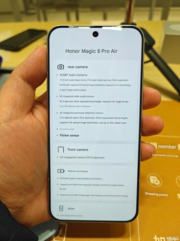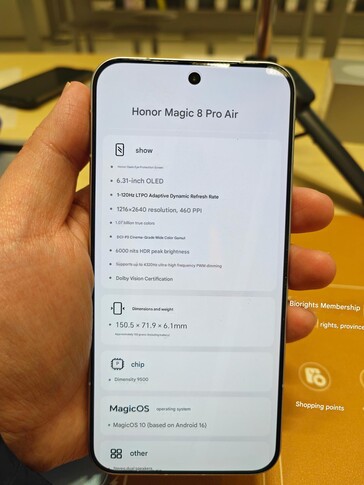 Comme vous pouvez le voir sur les images de prise en main traduites ci-dessous et sur l'image de comparaison de tous les téléphones Magic8 Honor ci-dessus, le Magic8 Pro Air n'est pas seulement plus fin, il est aussi plus compact. Au lieu d'un écran de 6,71 pouces, Honor a installé un panneau OLED de 6,31 pouces avec un taux de rafraîchissement dynamique de 1 120 Hz, une résolution de 2 640 x 1 216 et une luminosité maximale de 6 000 nits, avec prise en charge de Dolby Vision