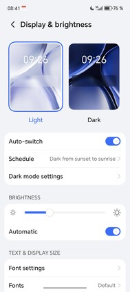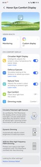 Le point de contact central du Honor Magic8 Pro est l'élément de menu "Honor Eye Comfort Display ", où toutes les fonctions supplémentaires peuvent être contrôlées directement. Outre la gradation PWM à haute fréquence, qui peut être utilisée à la fois à 3 840 Hz et à 4 320 Hz à une faible luminosité de l'écran, il existe également des fonctions courantes telles que "Natural Tone", qui ajuste les couleurs de l'écran à la lumière ambiante. Il en résulte un affichage plus chaud, car la proportion de lumière bleue est réduite. La fonction "Circadian Night Display" fonctionne de la même manière et vise à réduire la suppression des hormones du sommeil le soir. Il existe également un mode sombre configurable pour que l'écran affiche le contenu dans une tonalité plus sombre le soir, ce que la plupart des autres smartphones Android proposent également.