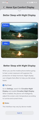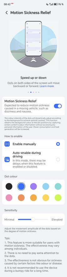 Une autre fonction spécifique à Honor est "Defocus Eyecare", qui simule le regard au loin pour soulager la fatigue oculaire et prend en charge plus de 2 000 applications. Le Magic8 Pro peut également soulager le mal des transports causé par les déplacements en véhicule. Des boules colorées sont affichées sur le bord de l'écran et se déplacent en fonction de l'accélération du véhicule. L'objectif est de réduire les risques d'étourdissement ou de nausée. Dans la pratique, cette méthode s'est révélée étonnamment efficace.