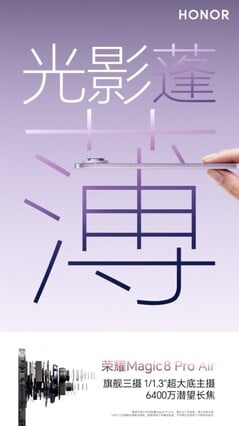 Avec une épaisseur de 0,24 pouces, le smartphone est environ 0,02 pouces plus épais que l'iPhone Air Apple iPhone Air, mais le fleuron de Honor est censé offrir un meilleur matériel à bien des égards. Comme Honor l'a déjà confirmé, le Magic 8 Pro Air est équipé d'un appareil photo principal de 50MP f/1.6 basé sur un capteur relativement grand de 1/1.3 pouces, qui est accompagné d'un téléobjectif périscopique de 64MP f/2.6 avec un zoom optique 3.2x. Les rumeurs font également état d'un appareil photo ultra grand angle de 50 Mpx f/2,2.