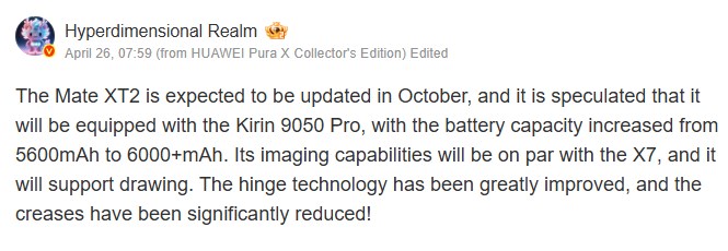 Selon la fuite, le Mate XT2 sera équipé de la puce Kirin 9050 Pro. En outre, bien que les détails concernant l'écran soient encore limités, l'auteur de la fuite affirme que Huawei a apporté des améliorations majeures à la technologie de la charnière. Cela permettra non seulement d'améliorer la durabilité du mécanisme de pliage, mais aussi de réduire les plis visibles, ce qui est l'une des principales préoccupations des téléphones pliables. A fuite précédente suggérait également que l'appareil pourrait utiliser du verre ultra-flexible avancé.