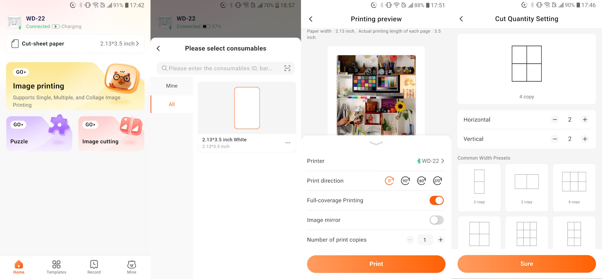 L'application est simple et facile à utiliser sans avoir à lire le manuel. Dans le coin supérieur gauche se trouve une icône représentant l'imprimante, sur laquelle il suffit de tapoter pour connaître l'état de l'imprimante. Au milieu de l'application se trouvent trois menus principaux : Impression d'images, Puzzle et Découpe d'images.