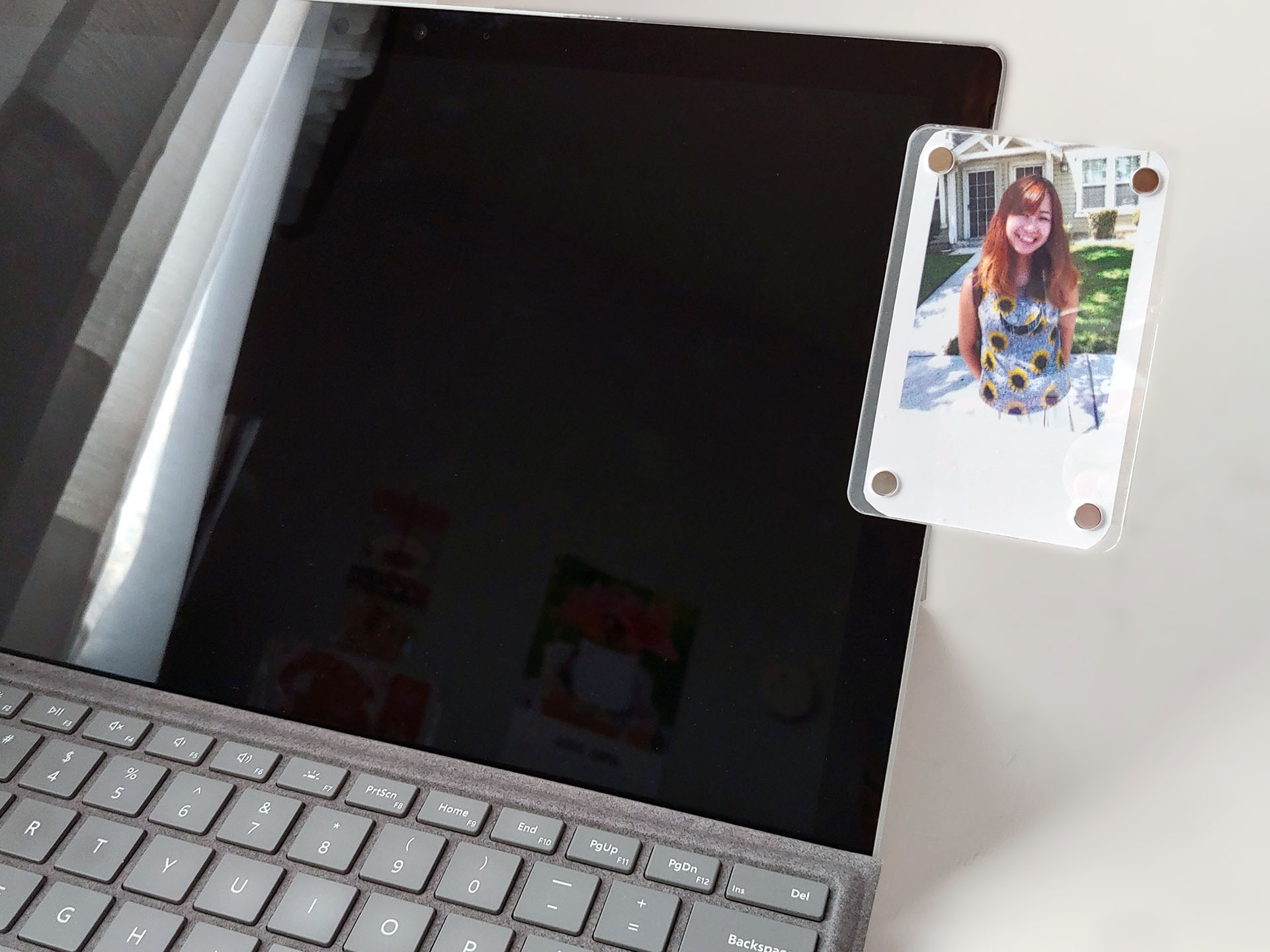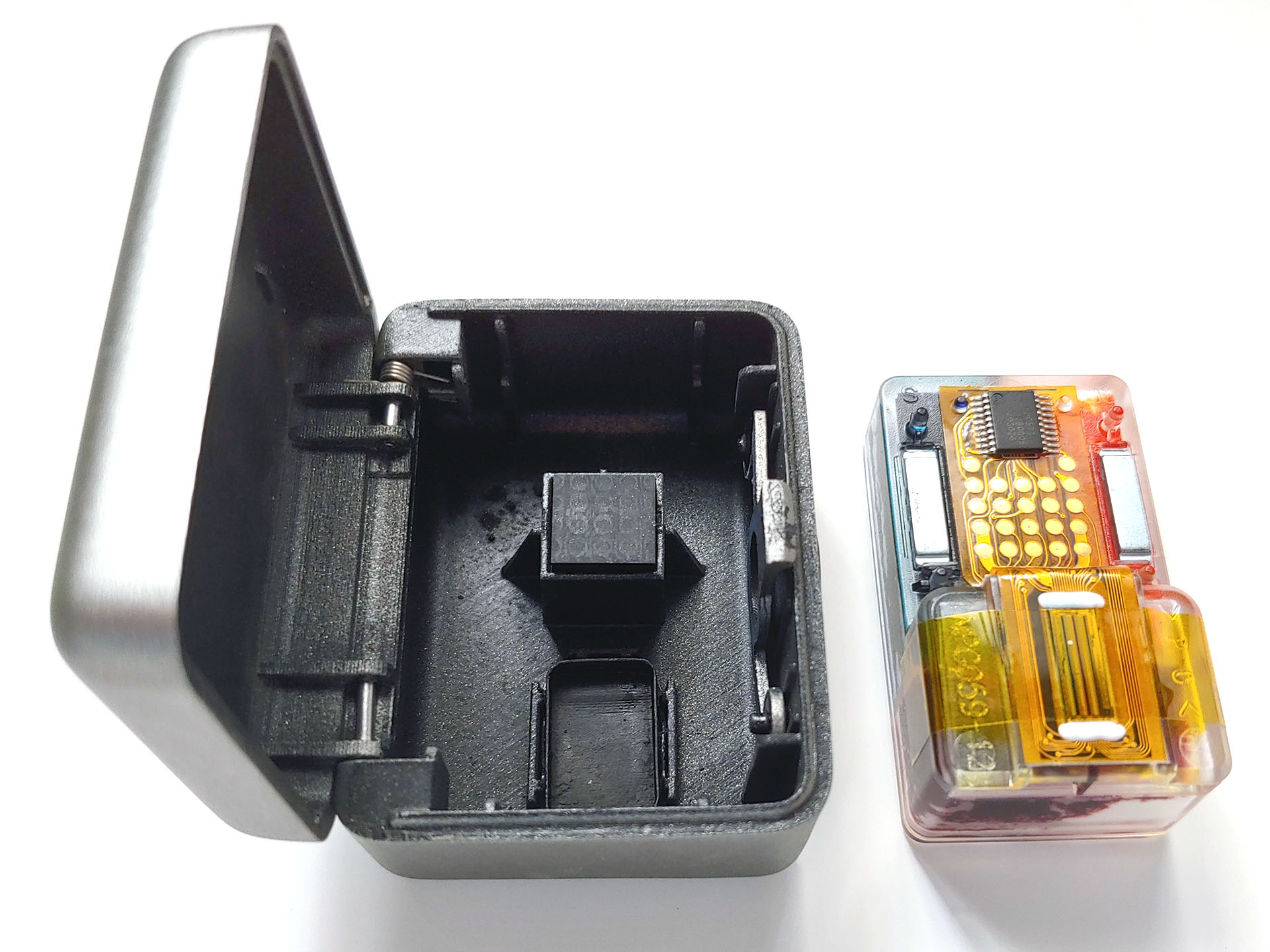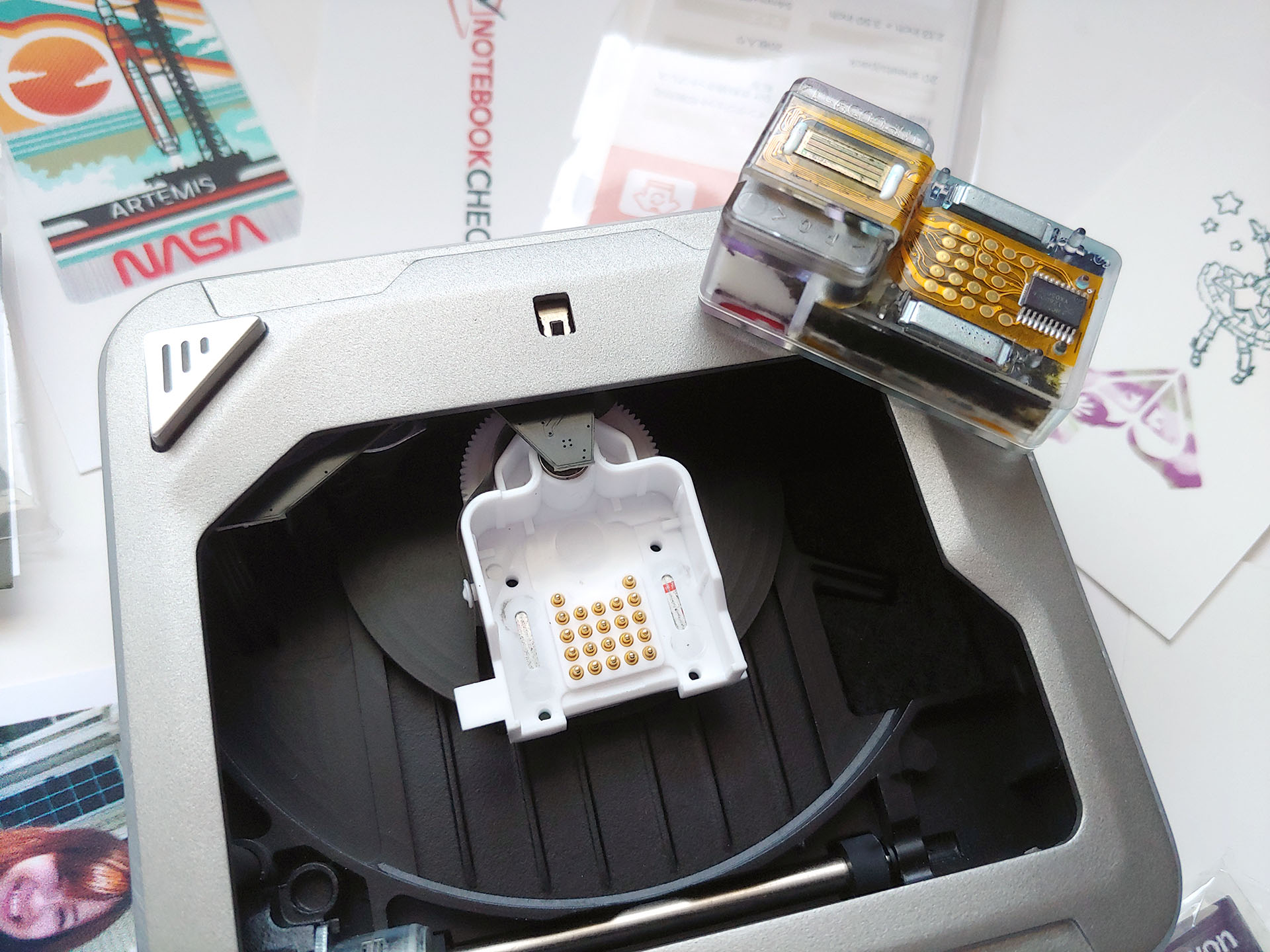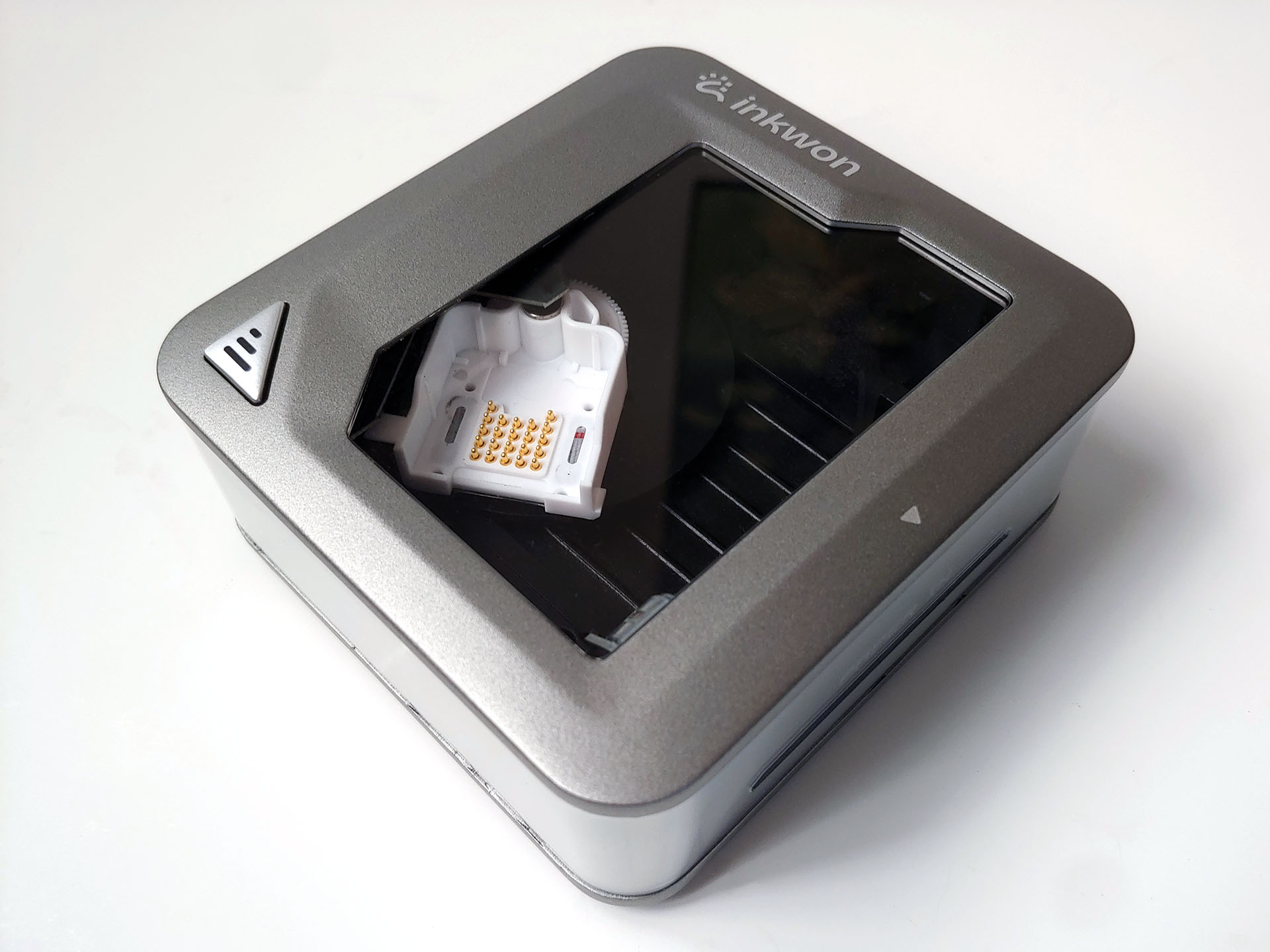 Le couvercle magnétique transparent de l'Inkwon Tag s'enlève facilement, révélant une cartouche qui se déplace d'un côté à l'autre pendant l'impression.
