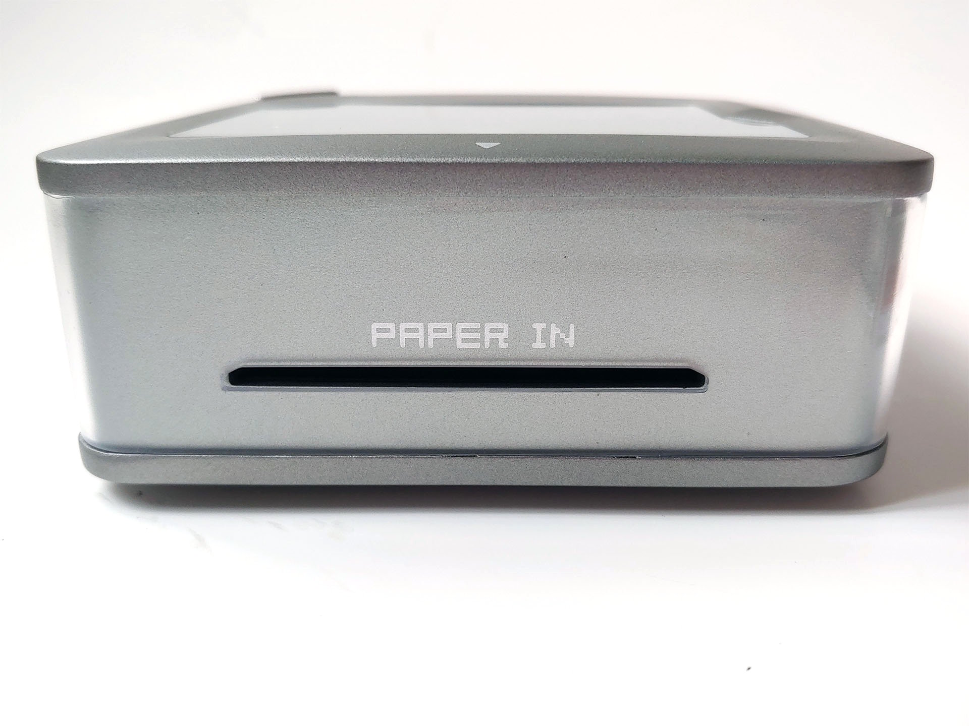 Les fentes de papier opposées gèrent l'alimentation automatique, avec un trou de réinitialisation, un port USB-C et un couvercle pour l'encre usagée sur un autre côté. L'imprimante compacte se glisse confortablement dans les grandes poches de veste ou les petits sacs.