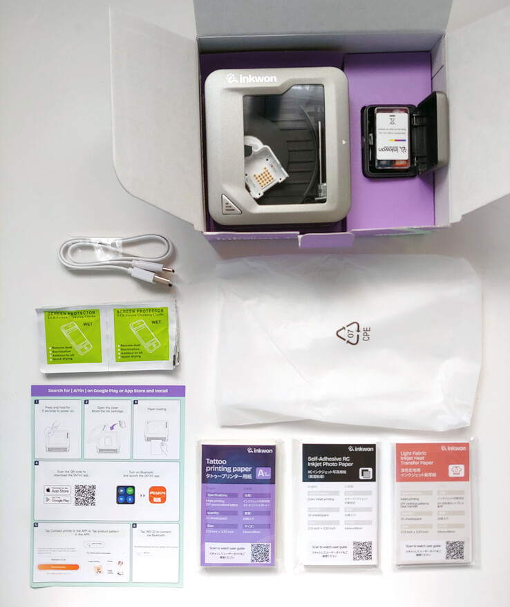 La boîte comprenait l'imprimante Inkwon Tag, un guide de démarrage rapide, un câble de charge USB-C, une cartouche à jet d'encre et un support de cartouche, des chiffons de nettoyage de la tête d'impression et un ensemble de papiers adhésifs, de tatouage et de transfert.