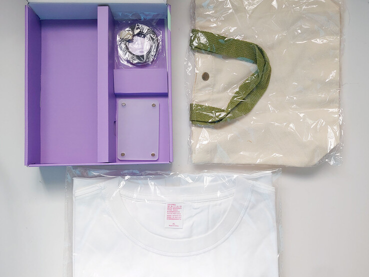 Un kit d'échantillons a été fourni, comprenant un T-shirt blanc, un sac à main, un cadre photo magnétique et un aimant flexible.