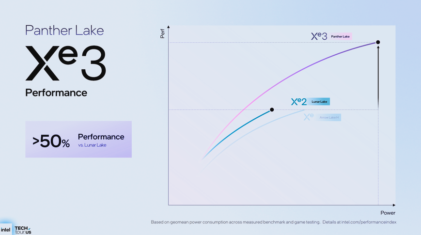 En ce qui concerne les performances, Intel a fait de grandes déclarations sur les performances iGPU de Panther Lake. Il prétend offrir jusqu'à 50 % d'augmentation des performances par rapport à Lunar Lake et 40 % d'augmentation des performances par watt. Comme toujours, il s'agit de benchmarks de première partie et il convient de les traiter avec scepticisme jusqu'à ce que des données supplémentaires apparaissent.