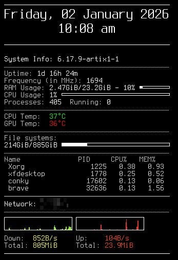 La personnalisation est une question de compromis et varie en fonction de l'environnement de bureau ou du gestionnaire de fenêtres que vous avez choisi. J'utilise XFCE4, qui peut être personnalisé dans une large mesure, mais dont l'embellissement nécessite quelques connaissances techniques. Il supporte un outil appelé Conky, qui peut afficher des informations système sur votre bureau. Il est hautement personnalisable mais utilise un format de typecript dans un fichier de configuration.