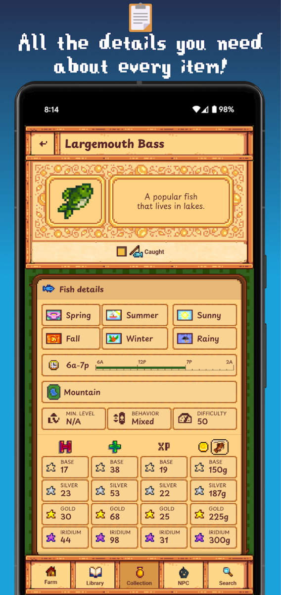 L'application Stardew Valley de BlueCaret permet aux joueurs de suivre facilement leur progression dans le jeu depuis leur smartphone. Elle propose une base de données d'objets complète, des guides pour les itinéraires du centre communautaire et de Joja, des préférences de cadeaux détaillées pour tous les villageois et des listes de collections bien organisées. Des outils supplémentaires sont disponibles avec la mise à niveau premium, qui coûte 5,99 $ en une seule fois. Ils comprennent un suivi de la perfection, des notes, un calendrier, des listes de tâches et la possibilité de gérer plusieurs fermes.