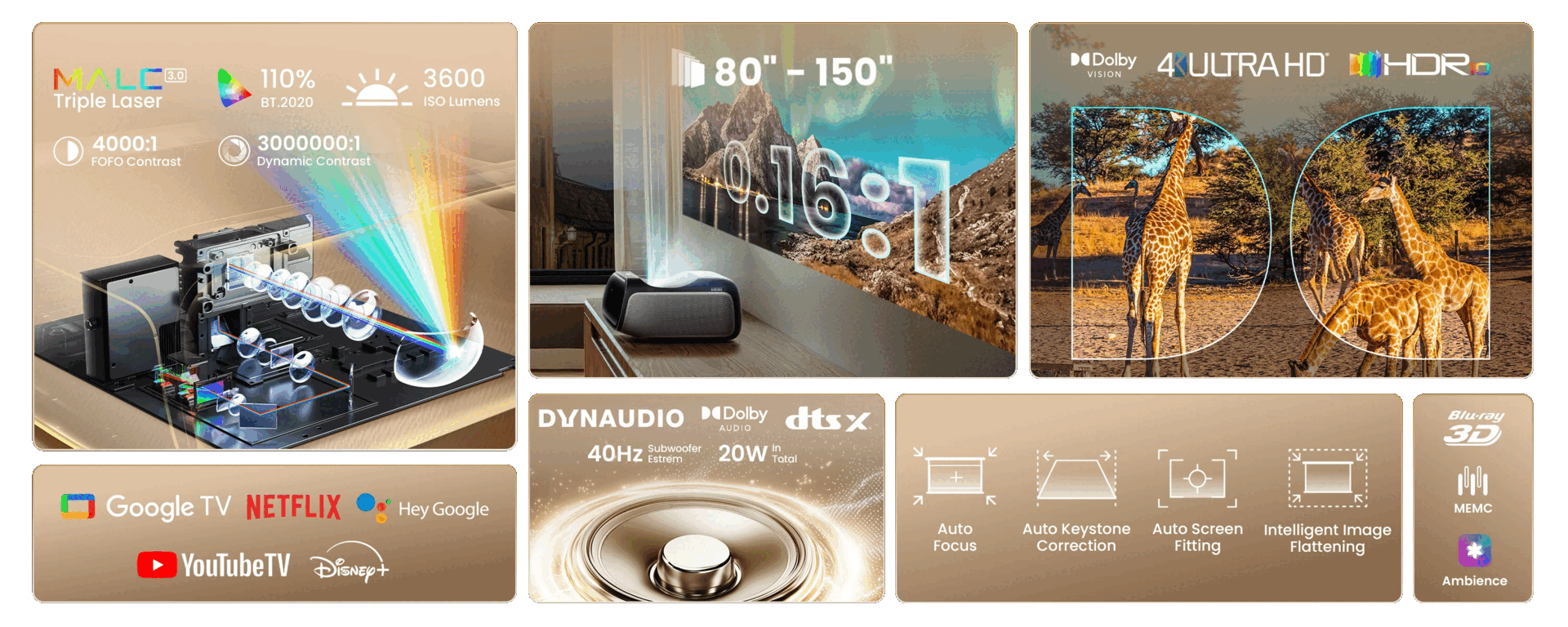 Jmgo a intégré son système tri-laser MALC 3.0 propriétaire dans l'O2S Ultra, qui est censé fournir une image 4K lumineuse et nette tout en couvrant 110 % de la gamme de couleurs BT.2020. En outre, il fonctionne avec Google TV et offre un accès à une large gamme de services de streaming, tels que Netflix, YouTube, Amazon Prime, Hulu, Disney+, et bien plus encore. Il prend également en charge les commandes vocales de l'assistant Google et la diffusion sans fil Google Cast via un smartphone.