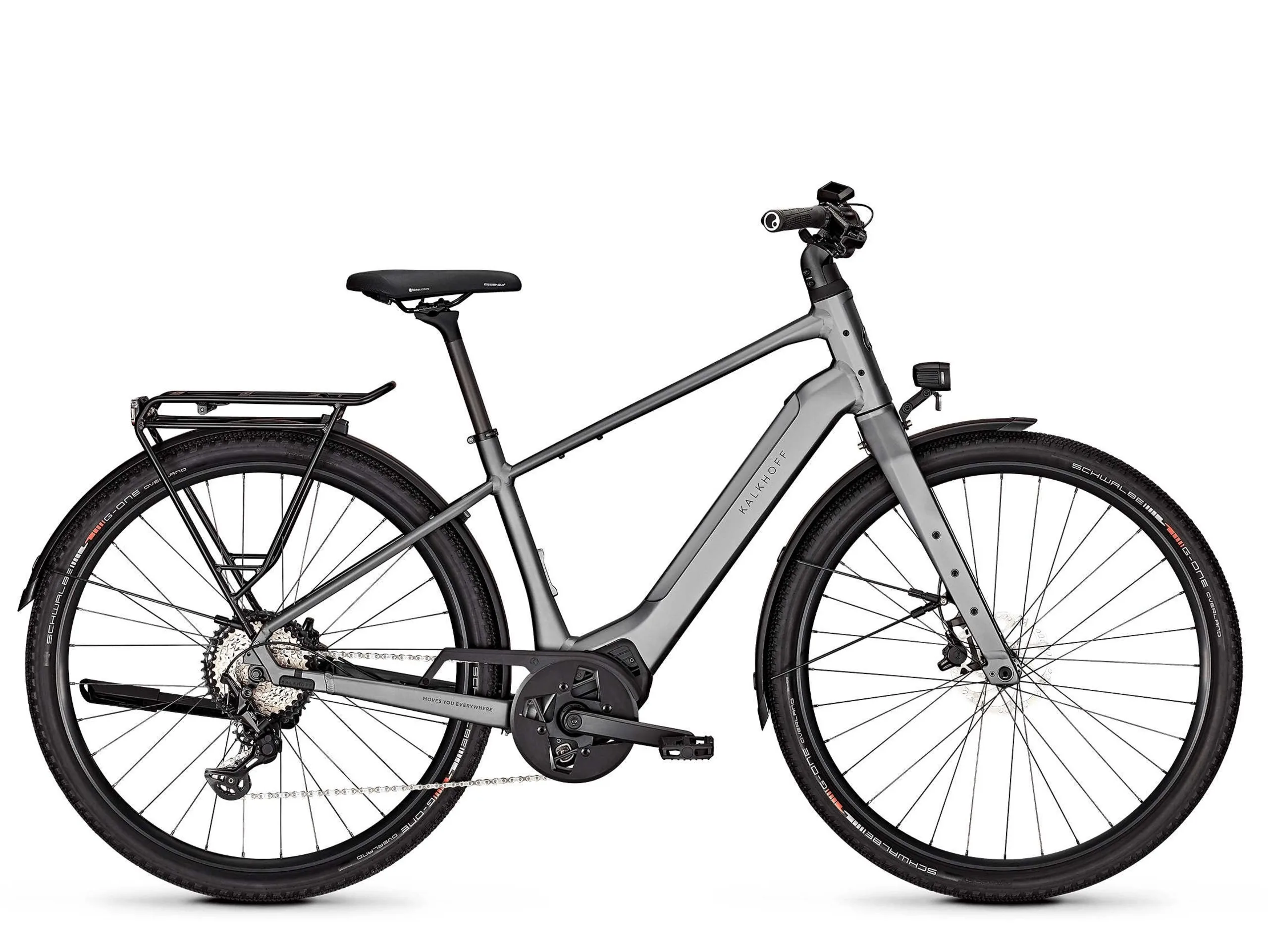 Les phares et les feux arrière sont de marque Herrmans. Une béquille arrière est disponible et des garde-boue sont également inclus. Kalkhoff a installé un moteur Bosch Performance Line SX, qui est un peu plus compact et plus léger, car le couple est limité à 55 Newton-mètres, mais cela ne devrait pas être une limitation majeure dans l'utilisation quotidienne. Un écran couleur Bosch Purion 200 est monté et la batterie Bosch CompactTube a une capacité de 400 Wh. Le vélo électrique est propulsé par une chaîne ; le système de dérailleur Shimano Deore XT comporte 12 vitesses. Les disques de frein hydrauliques Magura MT30 de 160 millimètres sont montés à l'avant et à l'arrière. Ils sont conçus pour fonctionner par tous les temps et peuvent donc freiner très fortement en cas d'urgence sur sol mouillé.