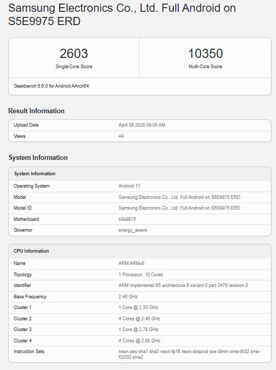 La liste montre le chipset avec une configuration déca-core comme l'Exynos 2600, mais en quatre groupes de cœurs : un cœur à 2,30 GHz, quatre cœurs à 2,40 GHz, un cœur à 2,78 GHz, et quatre cœurs supplémentaires à 2,88 GHz. À titre de comparaison, le cœur principal de l'Exynos 2600 tourne à 3,80 GHz, avec trois cœurs de performance supplémentaires à 3,25 GHz. Cela signifie que le chipset de nouvelle génération a encore beaucoup de performances à offrir, et il sera intéressant de voir comment les résultats des benchmarks CPU s'amélioreront au cours de l'année prochaine, à mesure que l'on se rapprochera du produit final.