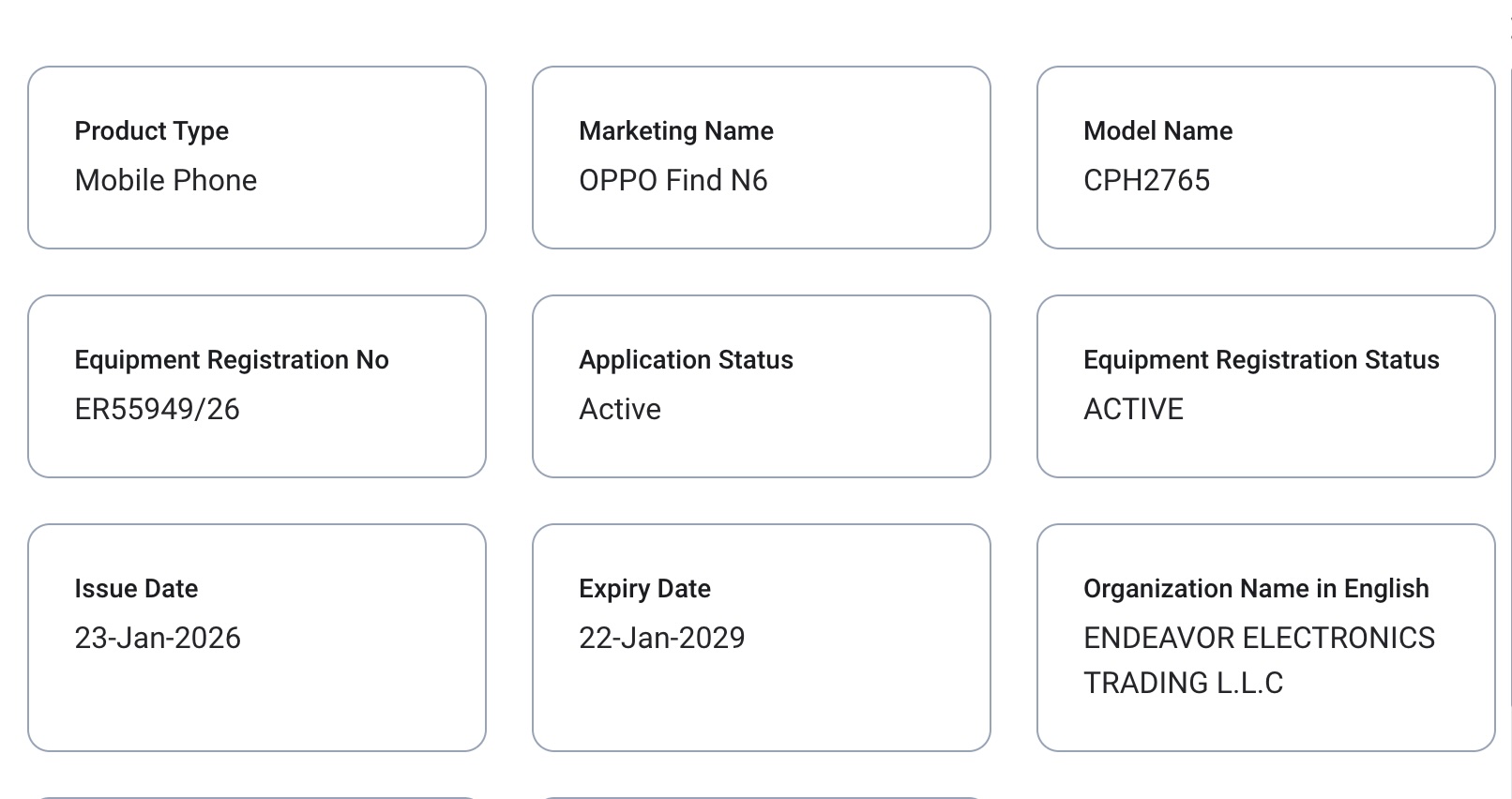 Une nouvelle inscription sur le site de l'organisme de réglementation TDRA des Émirats arabes unis confirme le numéro de modèle du Find N6 mondial Oppo Find N6. Contrairement au modèle chinois, qui porte le numéro de modèle "PLP110", la variante mondiale porte le numéro "CPH2765"