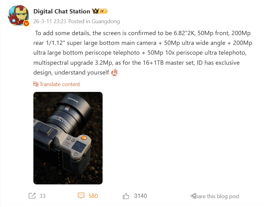 Les détails partagés par Digital Chat Station à propos de l'Oppo Find X9 Ultra semblent plus crédibles en comparaison. La plupart des spécifications mentionnées dans le récent message Weibo du leaker https://www.weibo.com/6048569942/QvIQ3ALF3?pagetype=profilefeed ont déjà circulé, y compris l'appareil photo principal de 200MP 1/1.12 pouces, qui devrait utiliser le même capteur Sony LYT-901 que celui confirmé pour le Vivo X300 Ultra. Outre un second téléobjectif périscope de 200 Mpx (3x), un téléobjectif périscope de 50 Mpx (10x) et une caméra ultra-large de 50 Mpx, le Find X9 Ultra serait doté d'un capteur multispectral comme son prédécesseur (amélioré à 3,2 Mpx selon le leaker), d'un écran 2K de 6,82 pouces et d'une caméra frontale de 50 Mpx. Un nouveau détail notable est la suggestion qu'Oppo pourrait sortir une édition Master, avec 16 Go de RAM, 1 To de stockage et un design exclusif. Le design final reste inconnu, mais Oppo pourrait s'inspirer de l'appareil photo Hasselblad X2D, comme le montre le post Weibo de l'auteur de la fuite