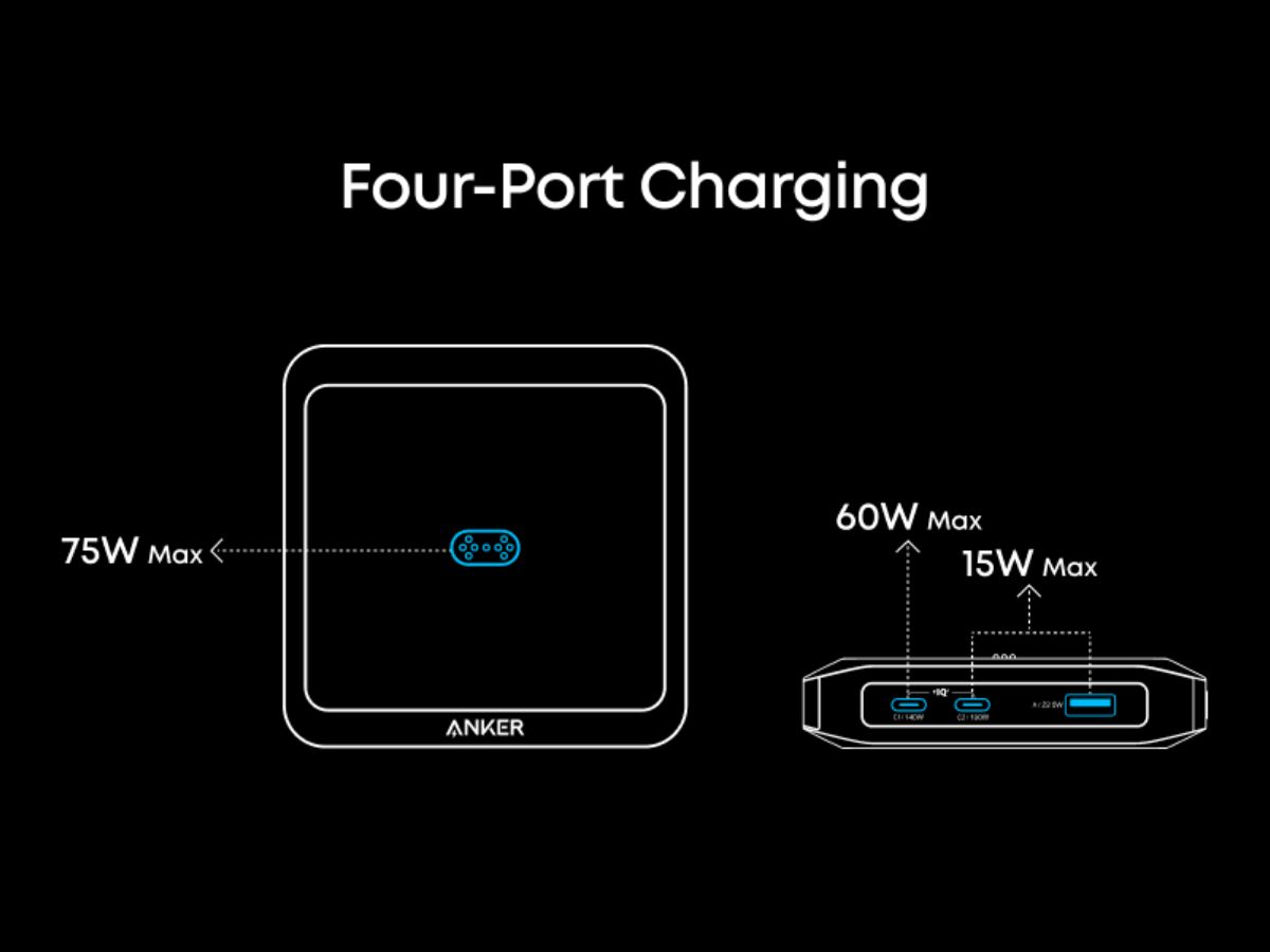 La Prime Charging Base d'Anker peut être utilisée pour charger jusqu'à quatre appareils simultanément, avec une prise en charge de la charge pass-through. La sortie principale de 150 W à broche pogo se trouve sur le dessus de la station de base, et il y a des ports USB-C de 140 W, USB-C de 100 W et USB-A de 22,5 W sur l'un des côtés. Parmi les autres caractéristiques de l'accessoire, citons l'éclairage dynamique de l'état de charge et la surveillance de la charge à distance via l'application pour smartphone de la marque. Il mesure 103 x 103 x 23 mm (~4,1 x 4,1 x 0,9 pouces) et pèse environ 350 g (~12,35 oz).