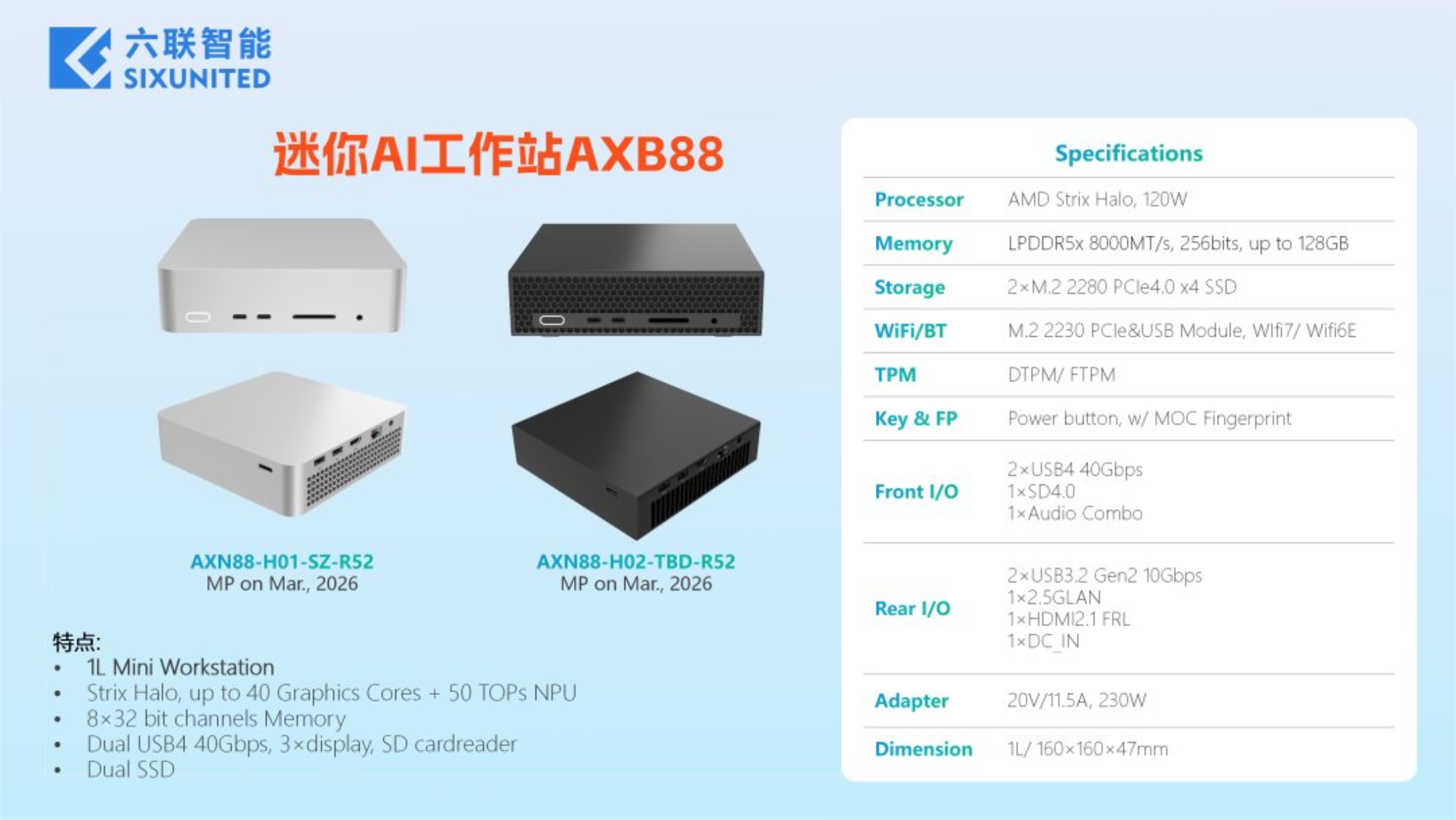 Dans le même temps, la société a également présenté deux mini-PC dotés de la même architecture. Ceux-ci sont dotés d'un boîtier de 2 litres ( ) et de 4 litres ( ) et des boîtiers de 4 litresrespectivement, Sixunited affirme être allé encore plus petit avec la Mini AI Workstation AXB88. Comme le montre le graphique ci-dessous, l'AXB88 mesure 160 x 160 x 47 mm quelles que soient les deux finitions présentées, ce qui est beaucoup plus petit que les mini-PC Strix Halo concurrents comme le GMKtec EVO-X2 (actuellement 1 699 $ sur Amazon).