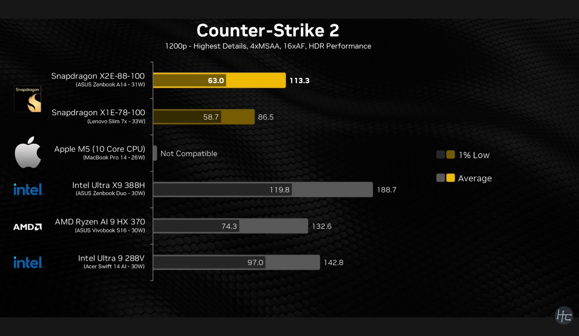 Nous observons le même schéma avec Counter-Strike 2, où le Snapdragon X2 Elite atteint une moyenne de plus de 113 FPS, mais les 1% de baisse restent à 63 FPS. Comparez cela à la moyenne du Core Ultra X9 388H de 188,7 FPS et aux 1% Lows de 119,8 FPS, et le problème devient très clair.