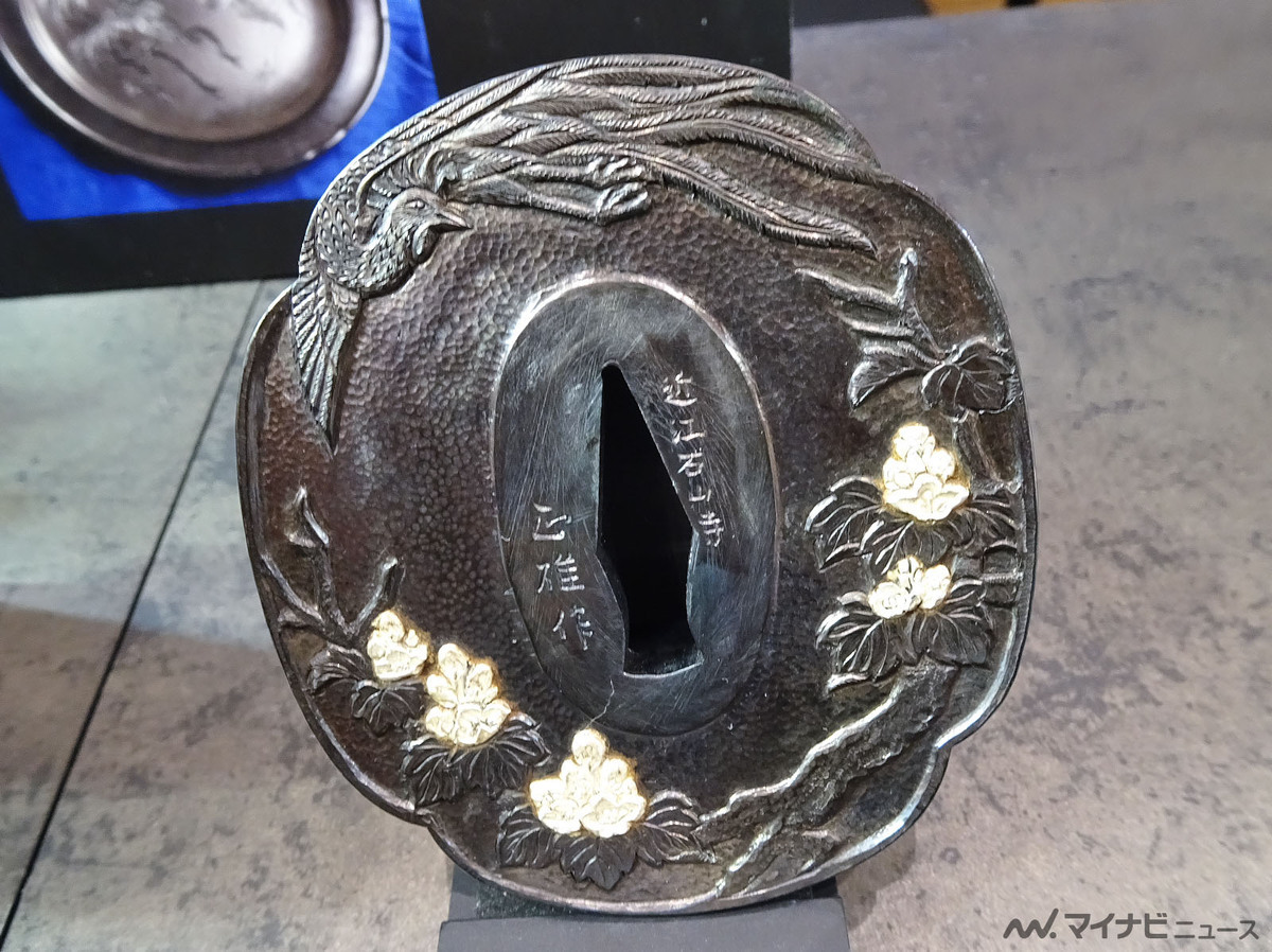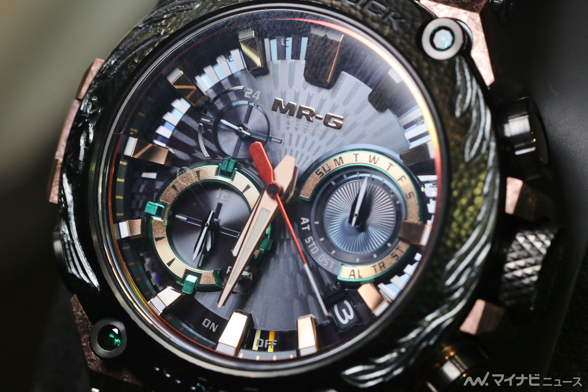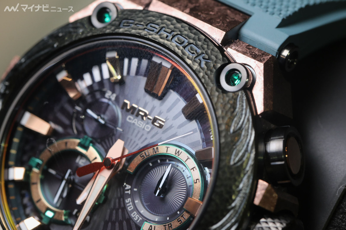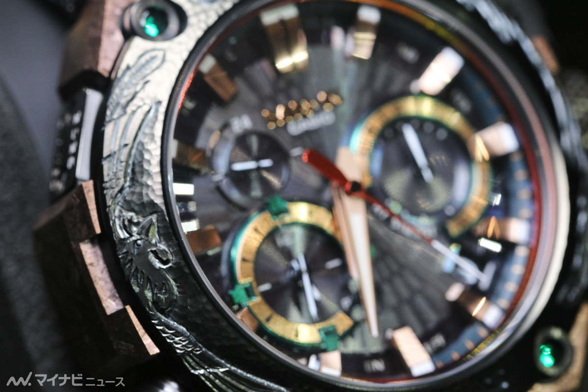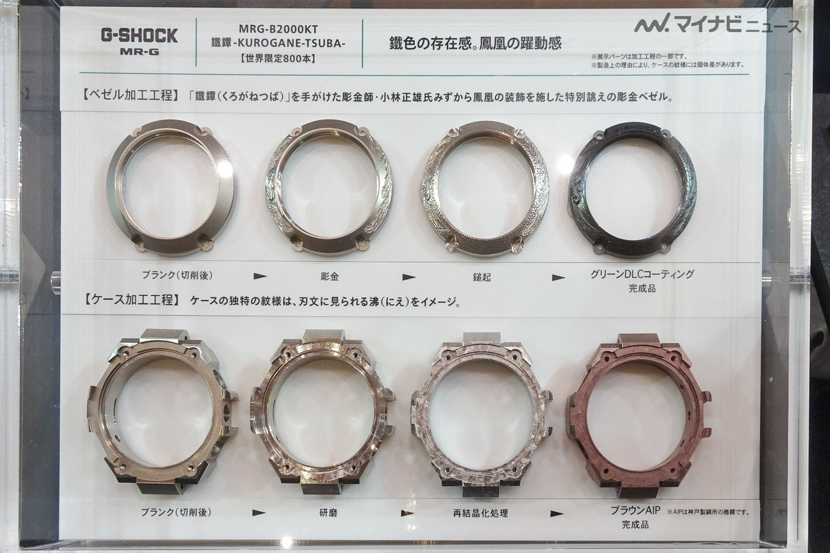 Les détails de la couronne texturée et de la lunette de la MRG-B2000KT-3A semblent encore plus complexes. Il convient également de noter que le bracelet en durasoft apparaît plus bleu que vert sur ces images. Lors de l'événement, la montre était accompagnée d'une tsuba de sabre japonaise qui aurait inspiré le design de la montre. Cette tsuba a également été fabriquée par Masao Kobayashi, l'artisan qui a gravé à la main ces montres Casio. Des expositions détaillaient également les processus de gravure de la lunette et de finition du boîtier.