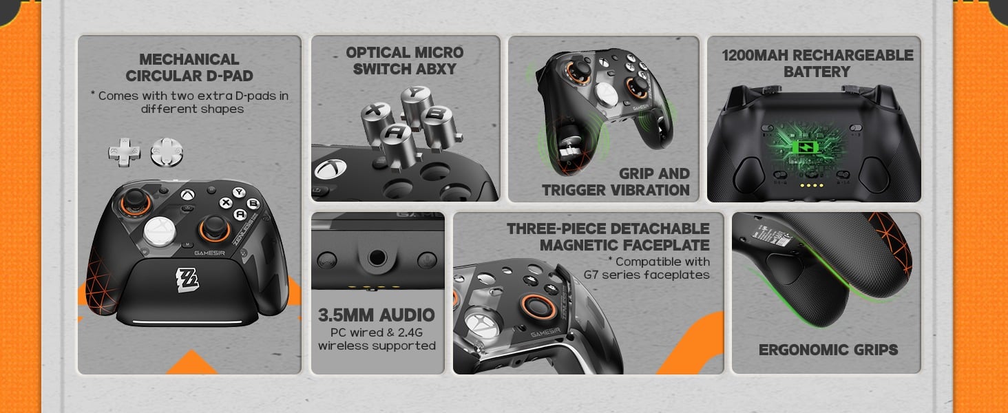 La manette est équipée de joysticks TMR, de boutons optiques ABXY à micro-interrupteur, de déclencheurs à effet Hall avec des arrêts de déclenchement à micro-interrupteur, et de quatre boutons remappables. Elle dispose d'une prise audio qui fonctionne lorsque la manette est connectée à un PC. Elle prend également en charge le contrôle des mouvements (PC uniquement) et est compatible avec le logiciel GameSir Nexus.