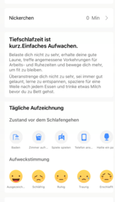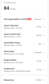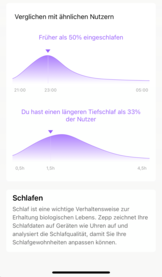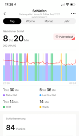 La smartwatch Amazfit enregistre à la fois le sommeil nocturne et la sieste en cours de journée. Le journal du sommeil ne peut être consulté que dans l'application. Il évalue la qualité du sommeil en général et le rapport proportionnel des phases de sommeil. Amazfit complète le cours de la fréquence cardiaque dans l'enregistrement des phases de sommeil, mais sans valeurs numériques.